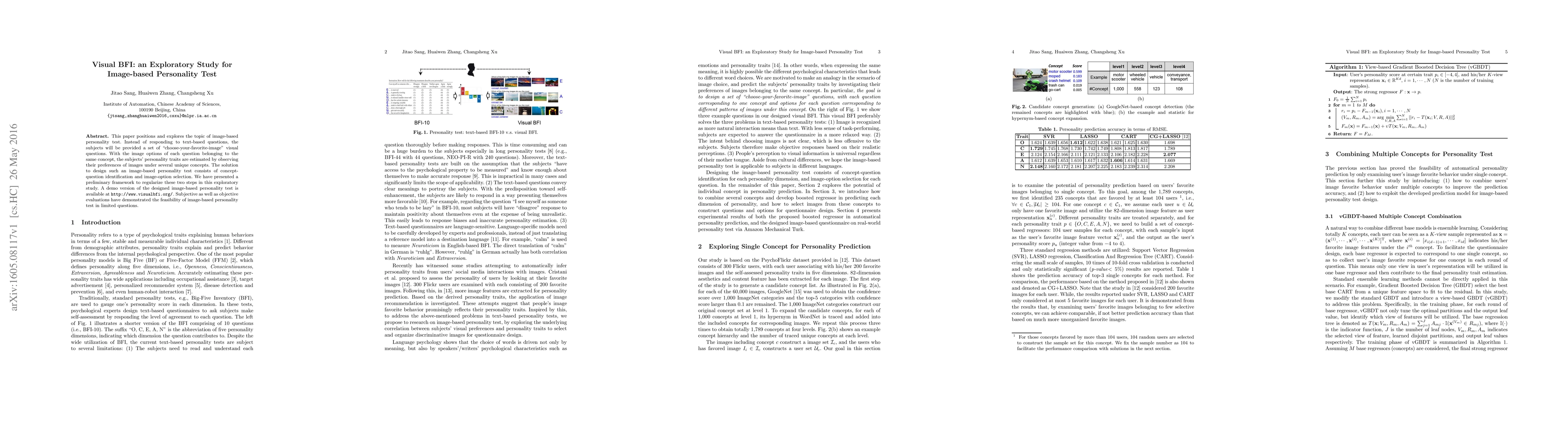 This paper positions and explores the topic of image-based personality test. Instead of responding to text-based questions, the subjects will be provided a set of "choose-your-favorite-image" visual questions. With the image options of each question belonging to the same concept, the subjects' personality traits are estimated by observing their preferences of images under several unique concepts. The solution to design such an image-based personality test consists of concept-question identification and image-option selection. We have presented a preliminary framework to regularize these two steps in this exploratory study. A demo version of the designed image-based personality test is available at http://www.visualbfi.org/. Subjective as well as objective evaluations have demonstrated the feasibility of image-based personality test in limited questions.