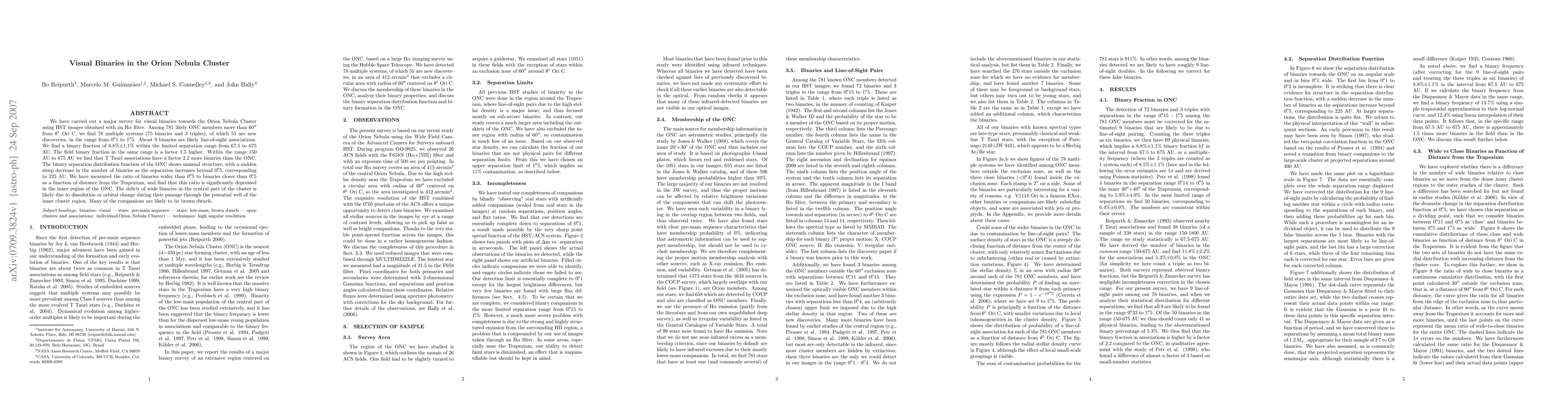 This study identifies 78 visual binaries in the Orion Nebula Cluster using HST images, revealing a binary fraction of 8.8% within 67.5 to 675 AU. The binary separation distribution shows unusual structure, with a notable decrease in binaries beyond 225 AU, suggesting dissolution or orbital changes in the inner cluster region.