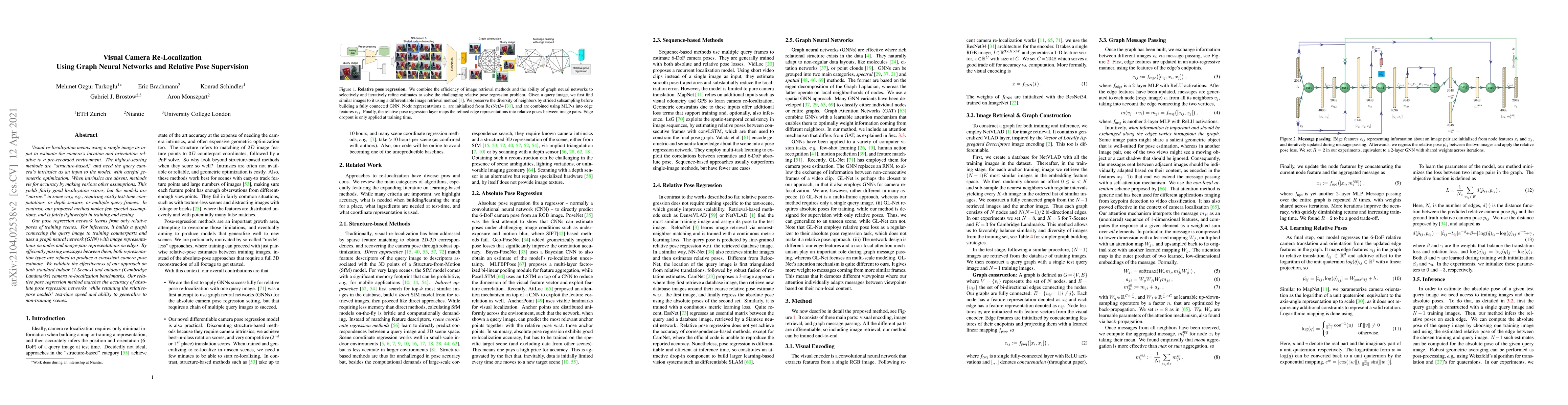 This paper proposes a lightweight visual camera re-localization method using graph neural networks and relative pose supervision, achieving competitive accuracy without requiring intrinsic parameters or costly computations. The method builds a graph connecting query images to training data and refines representations via GNN to estimate camera pose efficiently.