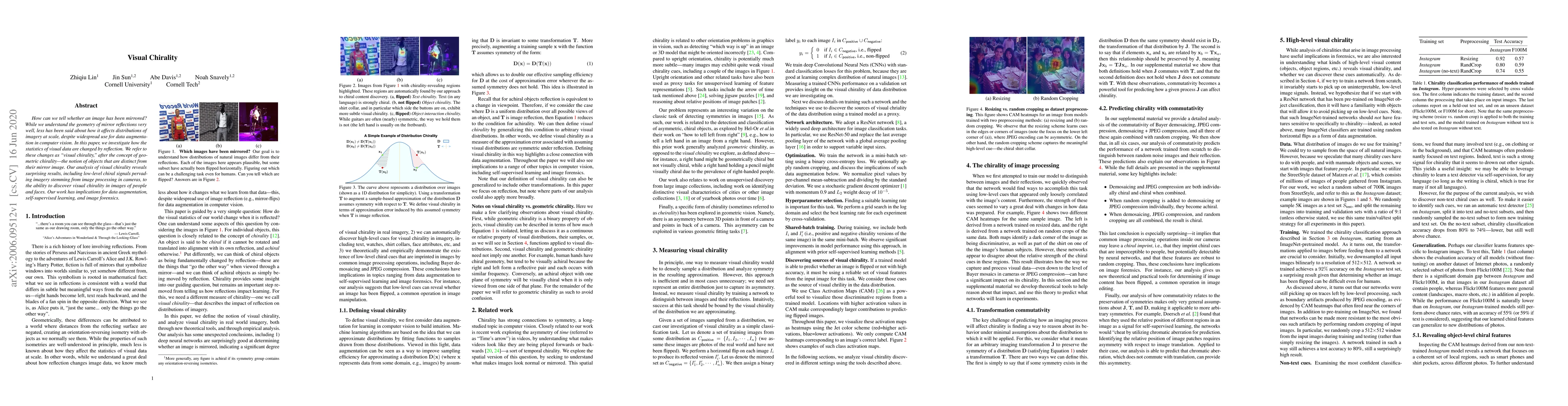 How can we tell whether an image has been mirrored? While we understand the geometry of mirror reflections very well, less has been said about how it affects distributions of imagery at scale, despite widespread use for data augmentation in computer vision. In this paper, we investigate how the statistics of visual data are changed by reflection. We refer to these changes as "visual chirality", after the concept of geometric chirality - the notion of objects that are distinct from their mirror image. Our analysis of visual chirality reveals surprising results, including low-level chiral signals pervading imagery stemming from image processing in cameras, to the ability to discover visual chirality in images of people and faces. Our work has implications for data augmentation, self-supervised learning, and image forensics.