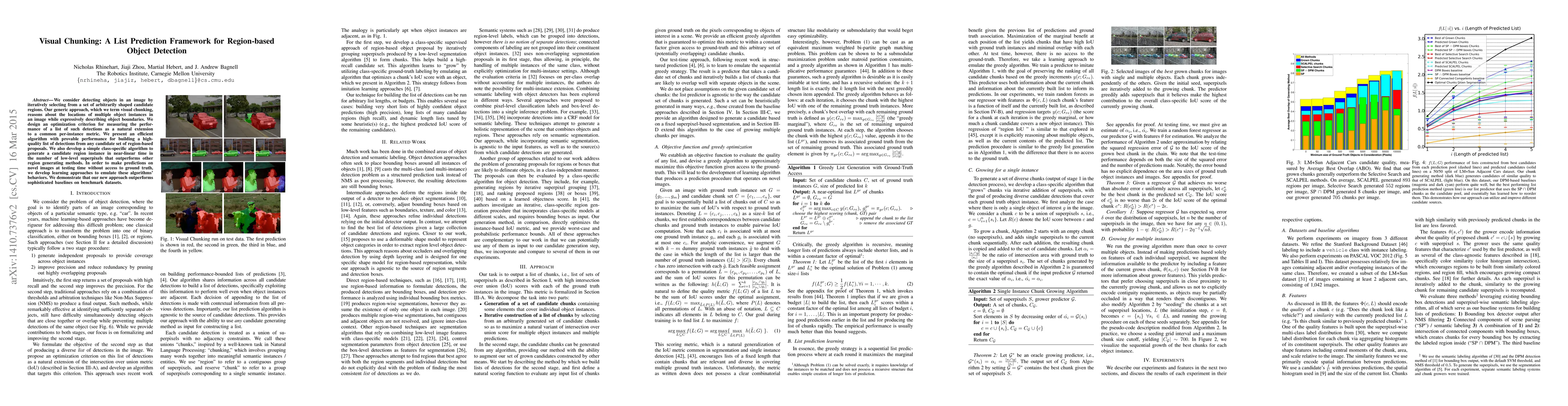 We consider detecting objects in an image by iteratively selecting from a set of arbitrarily shaped candidate regions. Our generic approach, which we term visual chunking, reasons about the locations of multiple object instances in an image while expressively describing object boundaries. We design an optimization criterion for measuring the performance of a list of such detections as a natural extension to a common per-instance metric. We present an efficient algorithm with provable performance for building a high-quality list of detections from any candidate set of region-based proposals. We also develop a simple class-specific algorithm to generate a candidate region instance in near-linear time in the number of low-level superpixels that outperforms other region generating methods. In order to make predictions on novel images at testing time without access to ground truth, we develop learning approaches to emulate these algorithms' behaviors. We demonstrate that our new approach outperforms sophisticated baselines on benchmark datasets.