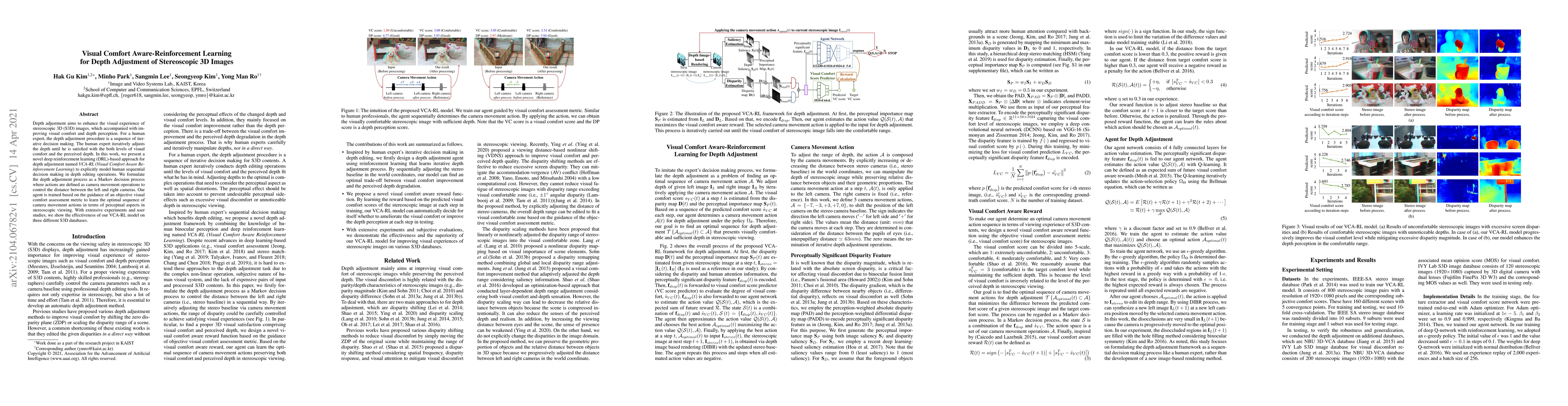 This paper introduces VCA-RL, a deep reinforcement learning approach for adjusting the depth of stereoscopic 3D images to enhance visual comfort and depth perception. The method models human decision-making through a Markov decision process, optimizing camera movement to achieve optimal visual comfort.