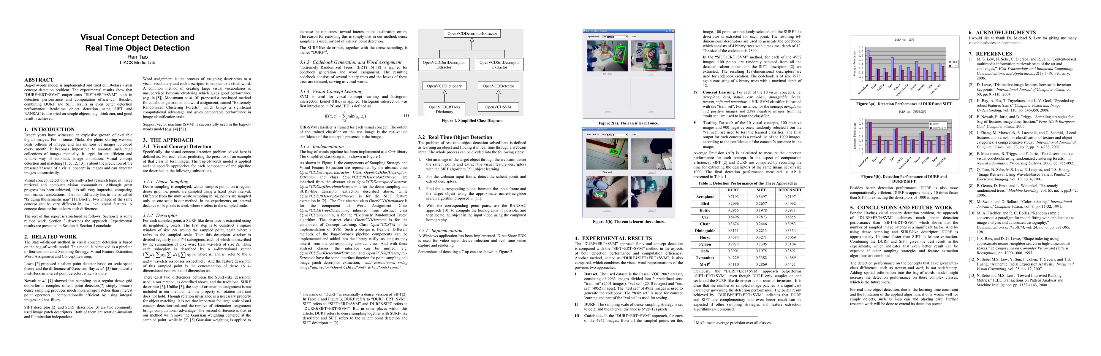 This paper compares the Bag-of-words model using DURF+ERT+SVM and SIFT+ERT+SVM for visual concept detection, finding that DURF+ERT+SVM outperforms in both performance and efficiency. Additionally, combining DURF and SIFT further enhances detection results, and real-time object detection using SIFT and RANSAC shows good results for simple objects like drink cans.