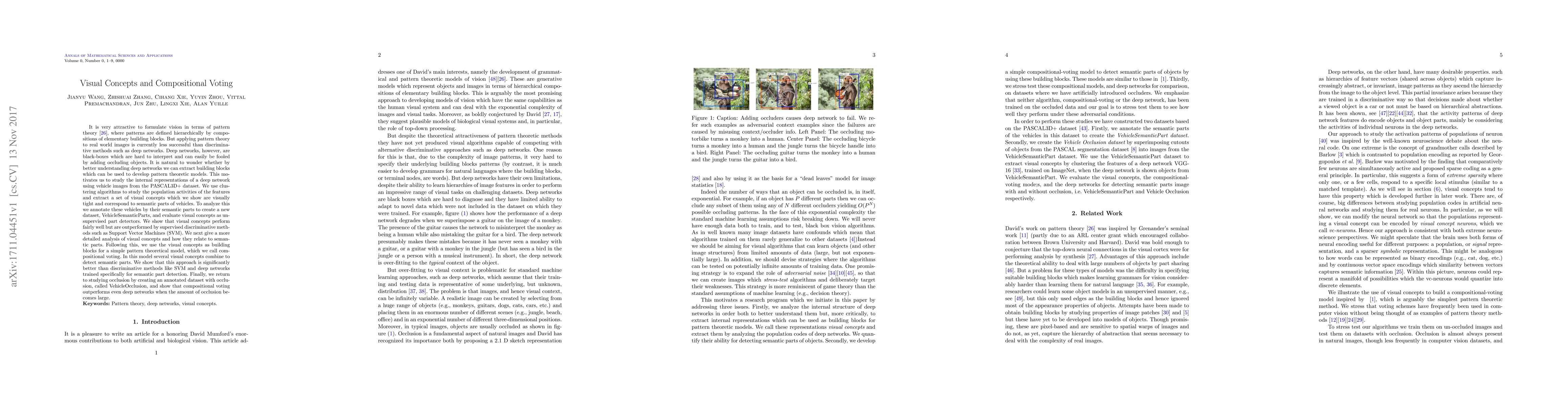 It is very attractive to formulate vision in terms of pattern theory \cite{Mumford2010pattern}, where patterns are defined hierarchically by compositions of elementary building blocks. But applying pattern theory to real world images is currently less successful than discriminative methods such as deep networks. Deep networks, however, are black-boxes which are hard to interpret and can easily be fooled by adding occluding objects. It is natural to wonder whether by better understanding deep networks we can extract building blocks which can be used to develop pattern theoretic models. This motivates us to study the internal representations of a deep network using vehicle images from the PASCAL3D+ dataset. We use clustering algorithms to study the population activities of the features and extract a set of visual concepts which we show are visually tight and correspond to semantic parts of vehicles. To analyze this we annotate these vehicles by their semantic parts to create a new dataset, VehicleSemanticParts, and evaluate visual concepts as unsupervised part detectors. We show that visual concepts perform fairly well but are outperformed by supervised discriminative methods such as Support Vector Machines (SVM). We next give a more detailed analysis of visual concepts and how they relate to semantic parts. Following this, we use the visual concepts as building blocks for a simple pattern theoretical model, which we call compositional voting. In this model several visual concepts combine to detect semantic parts. We show that this approach is significantly better than discriminative methods like SVM and deep networks trained specifically for semantic part detection. Finally, we return to studying occlusion by creating an annotated dataset with occlusion, called VehicleOcclusion, and show that compositional voting outperforms even deep networks when the amount of occlusion becomes large.