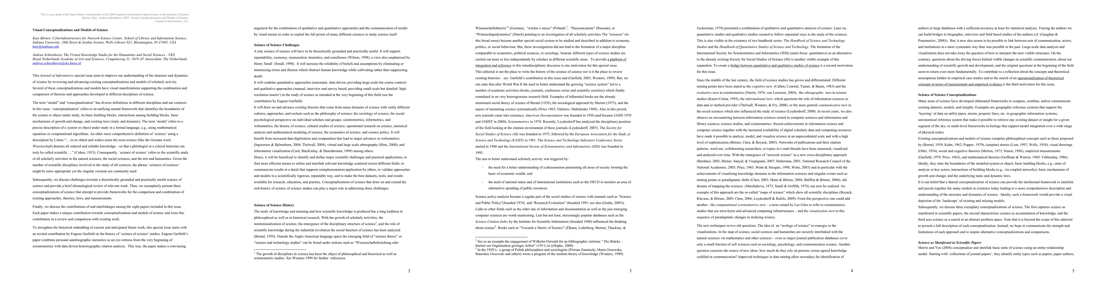 This Journal of Informetrics special issue aims to improve our understanding of the structure and dynamics of science by reviewing and advancing existing conceptualizations and models of scholarly activity. Several of these conceptualizations and models have visual manifestations supporting the combination and comparison of theories and approaches developed in different disciplines of science. Subsequently, we discuss challenges towards a theoretically grounded and practically useful science of science and provide a brief chronological review of relevant work. Then, we exemplarily present three conceptualizations of science that attempt to provide frameworks for the comparison and combination of existing approaches, theories, laws, and measurements. Finally, we discuss the contributions of and interlinkages among the eight papers included in this issue. Each paper makes a unique contribution towards conceptualizations and models of science and roots this contribution in a review and comparison with existing work.