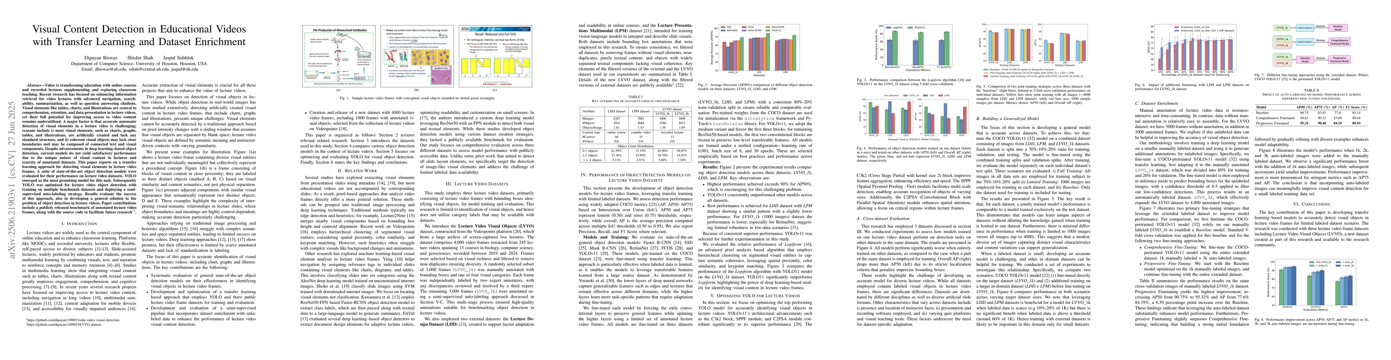 Video is transforming education with online courses and recorded lectures supplementing and replacing classroom teaching. Recent research has focused on enhancing information retrieval for video lectures with advanced navigation, searchability, summarization, as well as question answering chatbots. Visual elements like tables, charts, and illustrations are central to comprehension, retention, and data presentation in lecture videos, yet their full potential for improving access to video content remains underutilized. A major factor is that accurate automatic detection of visual elements in a lecture video is challenging; reasons include i) most visual elements, such as charts, graphs, tables, and illustrations, are artificially created and lack any standard structure, and ii) coherent visual objects may lack clear boundaries and may be composed of connected text and visual components. Despite advancements in deep learning based object detection, current models do not yield satisfactory performance due to the unique nature of visual content in lectures and scarcity of annotated datasets. This paper reports on a transfer learning approach for detecting visual elements in lecture video frames. A suite of state of the art object detection models were evaluated for their performance on lecture video datasets. YOLO emerged as the most promising model for this task. Subsequently YOLO was optimized for lecture video object detection with training on multiple benchmark datasets and deploying a semi-supervised auto labeling strategy. Results evaluate the success of this approach, also in developing a general solution to the problem of object detection in lecture videos. Paper contributions include a publicly released benchmark of annotated lecture video frames, along with the source code to facilitate future research.