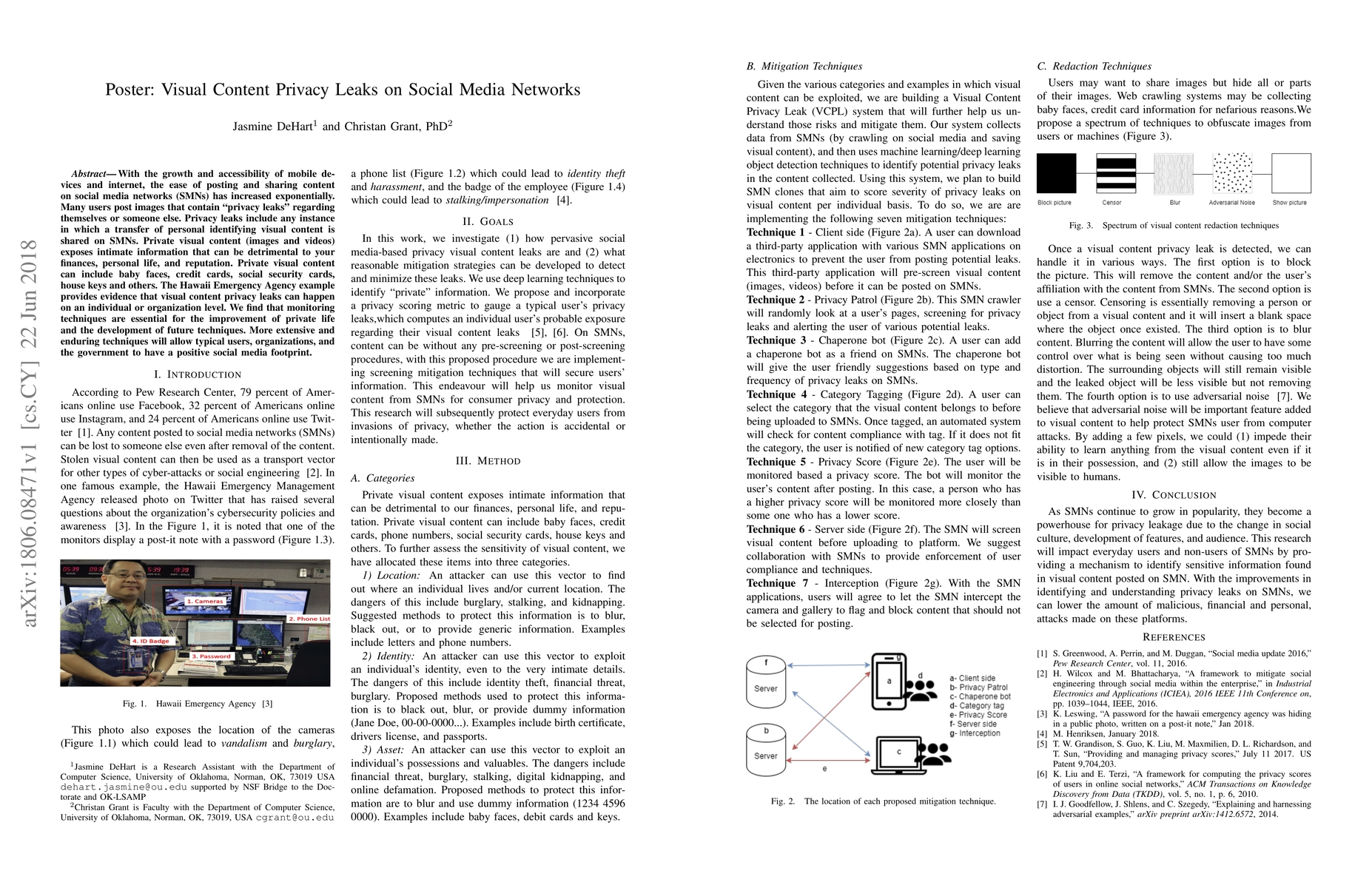 With the growth and accessibility of mobile devices and internet, the ease of posting and sharing content on social media networks (SMNs) has increased exponentially. Many users post images that contain "privacy leaks" regarding themselves or someone else. Privacy leaks include any instance in which a transfer of personal identifying visual content is shared on SMNs. Private visual content (images and videos) exposes intimate information that can be detrimental to your finances, personal life, and reputation. Private visual content can include baby faces, credit cards, social security cards, house keys and others. The Hawaii Emergency Agency example provides evidence that visual content privacy leaks can happen on an individual or organization level. We find that monitoring techniques are essential for the improvement of private life and the development of future techniques. More extensive and enduring techniques will allow typical users, organizations, and the government to have a positive social media footprint.