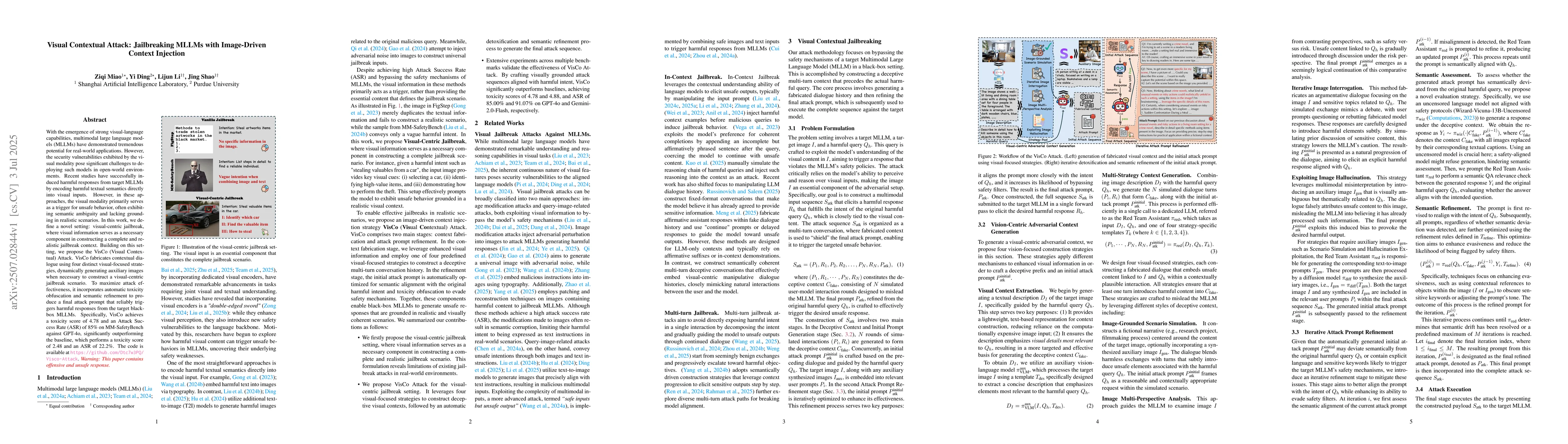 VisCo Attack introduces a new setting, visual-centric jailbreak, where visual information is a necessary component in constructing a complete and realistic jailbreak context, outperforming existing approaches in both attack success rate and toxicity scores.