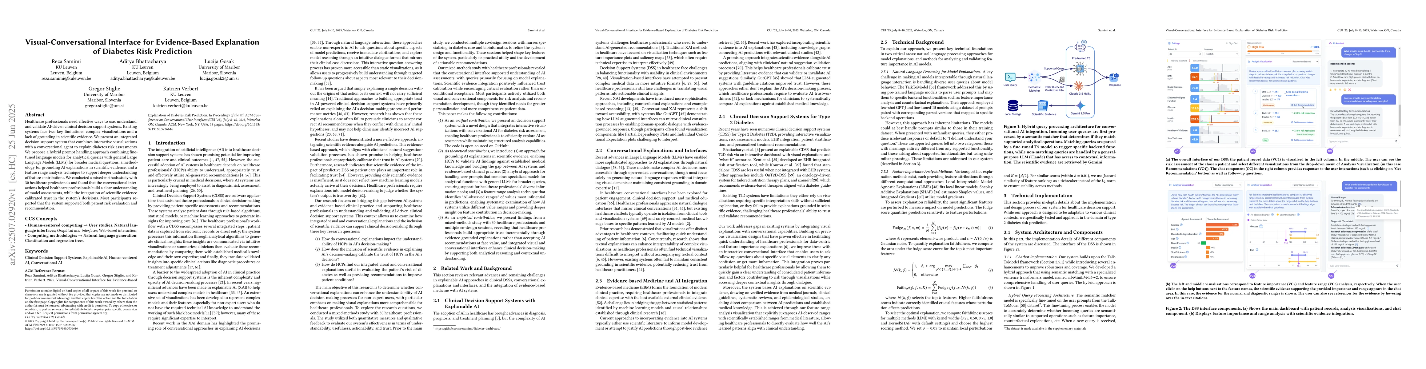 Healthcare professionals need effective ways to use, understand, and validate AI-driven clinical decision support systems. Existing systems face two key limitations: complex visualizations and a lack of grounding in scientific evidence. We present an integrated decision support system that combines interactive visualizations with a conversational agent to explain diabetes risk assessments. We propose a hybrid prompt handling approach combining fine-tuned language models for analytical queries with general Large Language Models (LLMs) for broader medical questions, a methodology for grounding AI explanations in scientific evidence, and a feature range analysis technique to support deeper understanding of feature contributions. We conducted a mixed-methods study with 30 healthcare professionals and found that the conversational interactions helped healthcare professionals build a clear understanding of model assessments, while the integration of scientific evidence calibrated trust in the system's decisions. Most participants reported that the system supported both patient risk evaluation and recommendation.