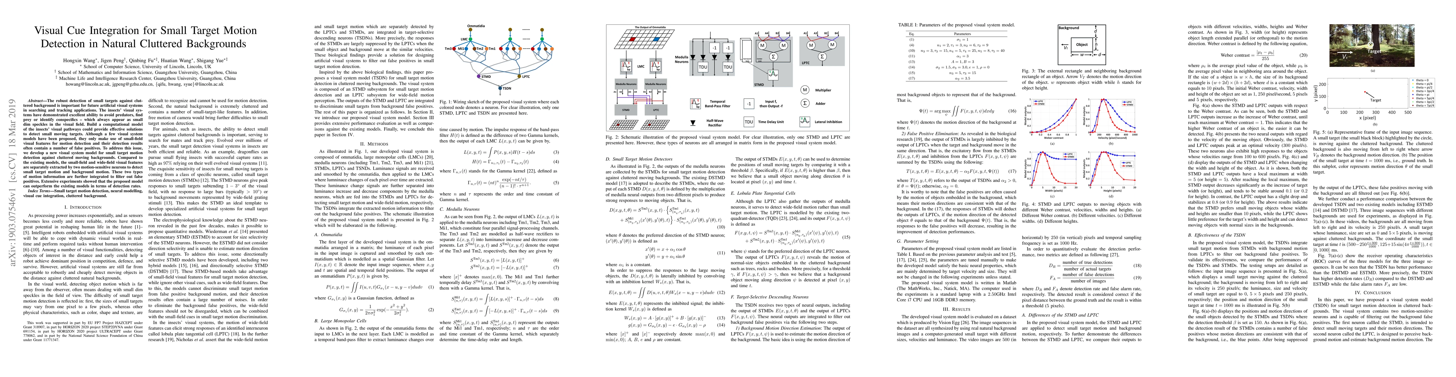 This paper proposes a new computational model for detecting small moving targets against cluttered backgrounds by integrating small-field and wide-field visual features through motion-sensitive neurons, significantly reducing false positives compared to existing models. The model's superior performance is demonstrated through extensive experiments.