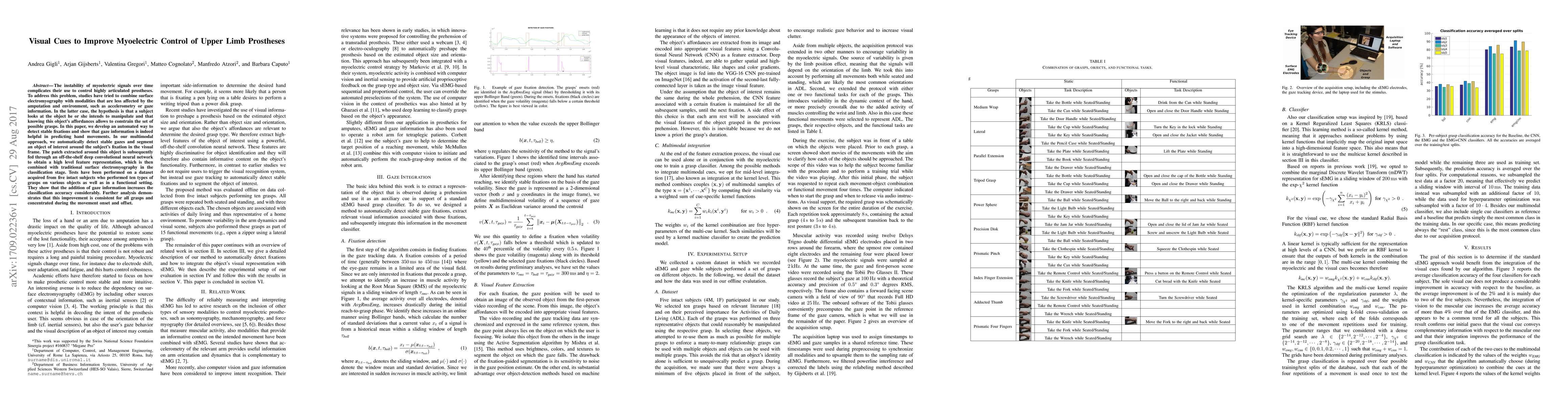 The instability of myoelectric signals over time complicates their use to control highly articulated prostheses. To address this problem, studies have tried to combine surface electromyography with modalities that are less affected by the amputation and environment, such as accelerometry or gaze information. In the latter case, the hypothesis is that a subject looks at the object he or she intends to manipulate and that knowing this object's affordances allows to constrain the set of possible grasps. In this paper, we develop an automated way to detect stable fixations and show that gaze information is indeed helpful in predicting hand movements. In our multimodal approach, we automatically detect stable gazes and segment an object of interest around the subject's fixation in the visual frame. The patch extracted around this object is subsequently fed through an off-the-shelf deep convolutional neural network to obtain a high level feature representation, which is then combined with traditional surface electromyography in the classification stage. Tests have been performed on a dataset acquired from five intact subjects who performed ten types of grasps on various objects as well as in a functional setting. They show that the addition of gaze information increases the classification accuracy considerably. Further analysis demonstrates that this improvement is consistent for all grasps and concentrated during the movement onset and offset.