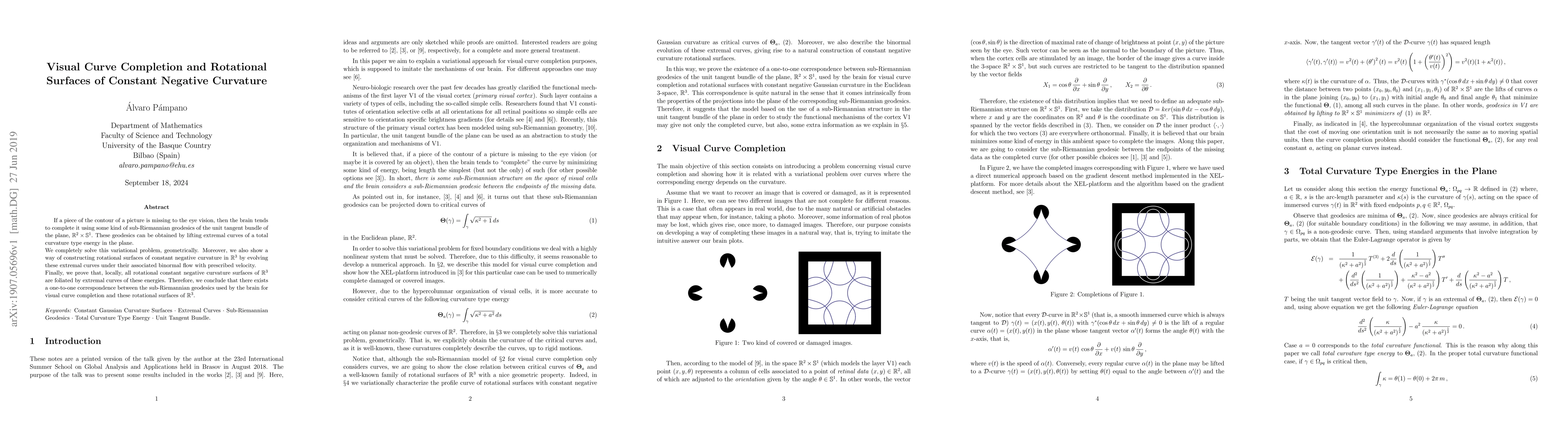 This paper solves the problem of completing missing contour pieces using sub-Riemannian geodesics, demonstrating a method for constructing rotational surfaces of constant negative curvature in R3. It establishes a local correspondence between these geodesics and the foliated surfaces, linking visual curve completion to rotational surfaces.