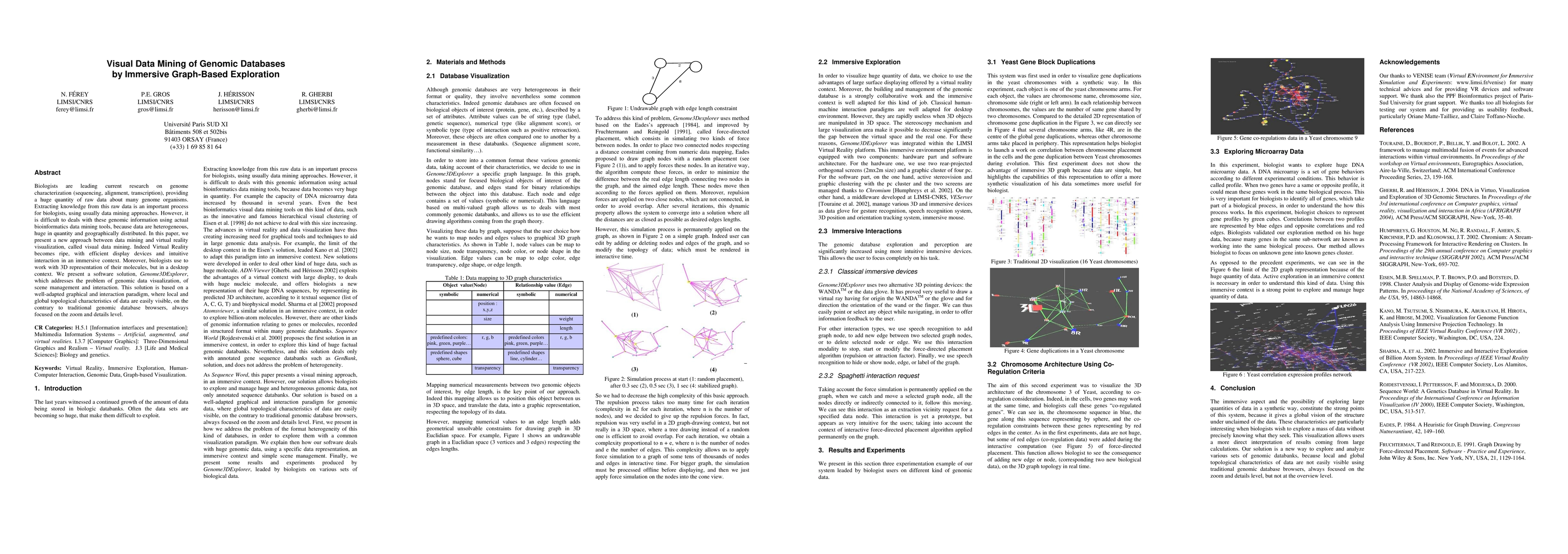 This paper introduces Genome3DExplorer, a novel immersive graph-based visualization tool for exploring genomic databases. It aims to address the challenges of visualizing large, heterogeneous, and geographically distributed genomic data by leveraging virtual reality for intuitive 3D interaction and scene management.