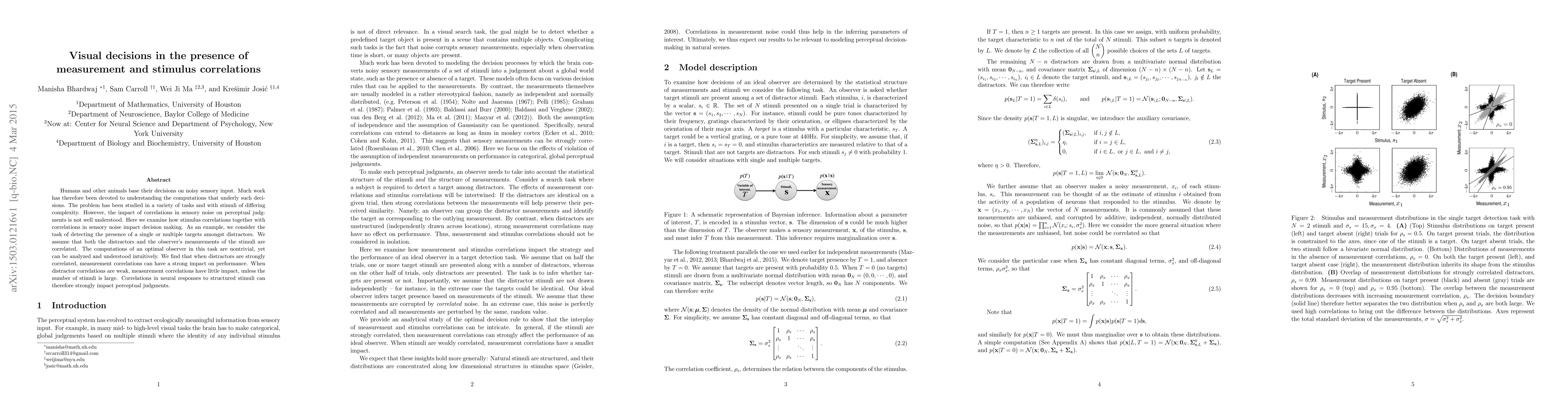 Humans and other animals base their decisions on noisy sensory input. Much work has therefore been devoted to understanding the computations that underly such decisions. The problem has been studied in a variety of tasks and with stimuli of differing complexity. However, the impact of correlations in sensory noise on perceptual judgments is not well understood. Here we examine how stimulus correlations together with correlations in sensory noise impact decision making. As an example, we consider the task of detecting the presence of a single or multiple targets amongst distractors. We assume that both the distractors and the observer's measurements of the stimuli are correlated. The computations of an optimal observer in this task are nontrivial, yet can be analyzed and understood intuitively. We find that when distractors are strongly correlated, measurement correlations can have a strong impact on performance. When distractor correlations are weak, measurement correlations have little impact, unless the number of stimuli is large. Correlations in neural responses to structured stimuli can therefore strongly impact perceptual judgments.