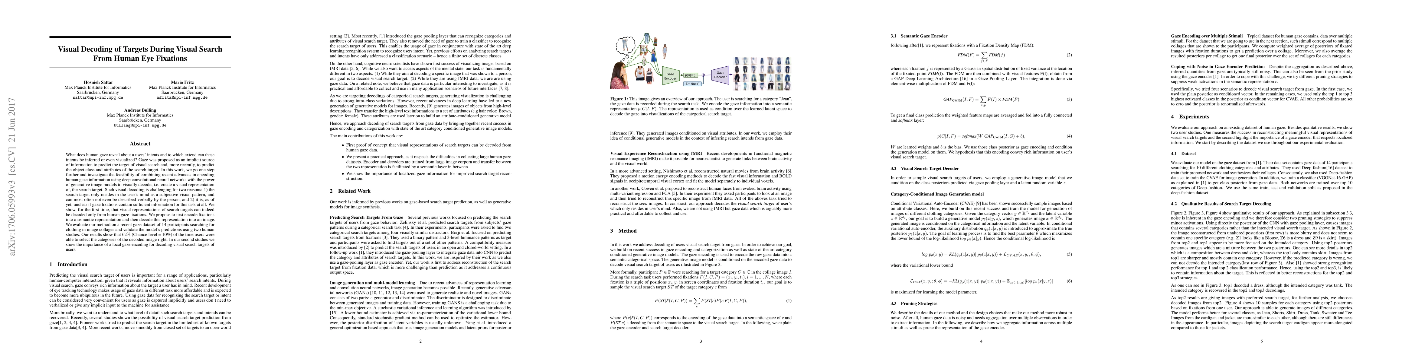 What does human gaze reveal about a users' intents and to which extend can these intents be inferred or even visualized? Gaze was proposed as an implicit source of information to predict the target of visual search and, more recently, to predict the object class and attributes of the search target. In this work, we go one step further and investigate the feasibility of combining recent advances in encoding human gaze information using deep convolutional neural networks with the power of generative image models to visually decode, i.e. create a visual representation of, the search target. Such visual decoding is challenging for two reasons: 1) the search target only resides in the user's mind as a subjective visual pattern, and can most often not even be described verbally by the person, and 2) it is, as of yet, unclear if gaze fixations contain sufficient information for this task at all. We show, for the first time, that visual representations of search targets can indeed be decoded only from human gaze fixations. We propose to first encode fixations into a semantic representation and then decode this representation into an image. We evaluate our method on a recent gaze dataset of 14 participants searching for clothing in image collages and validate the model's predictions using two human studies. Our results show that 62% (Chance level = 10%) of the time users were able to select the categories of the decoded image right. In our second studies we show the importance of a local gaze encoding for decoding visual search targets of user