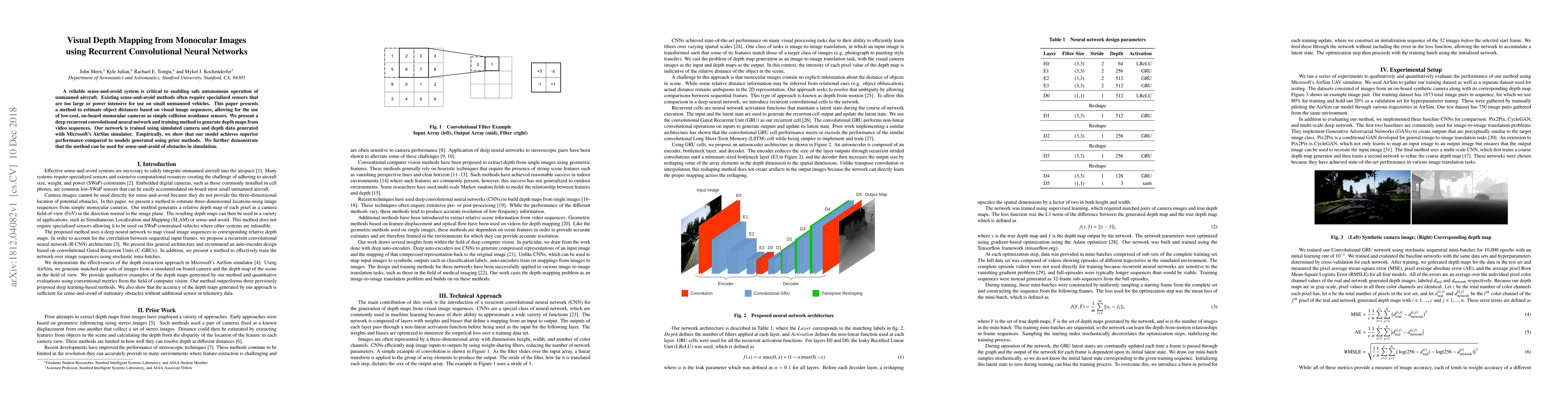 The paper presents a deep recurrent convolutional neural network (RCNN) trained using simulated camera and depth data from Microsoft's AirSim simulator to generate depth maps from video sequences for collision avoidance in autonomous vehicles.