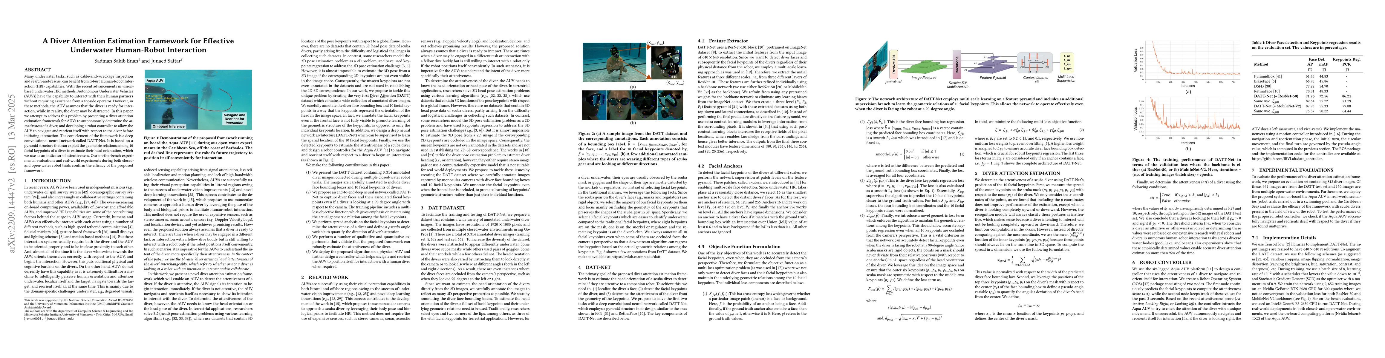 This paper proposes a diver attention estimation framework using DATT-Net, a deep neural network that analyzes facial keypoints to determine diver head orientation and attentiveness, enabling autonomous underwater vehicles to initiate human-robot interactions. Experimental results show promising accuracy and real-time applicability for underwater tasks.