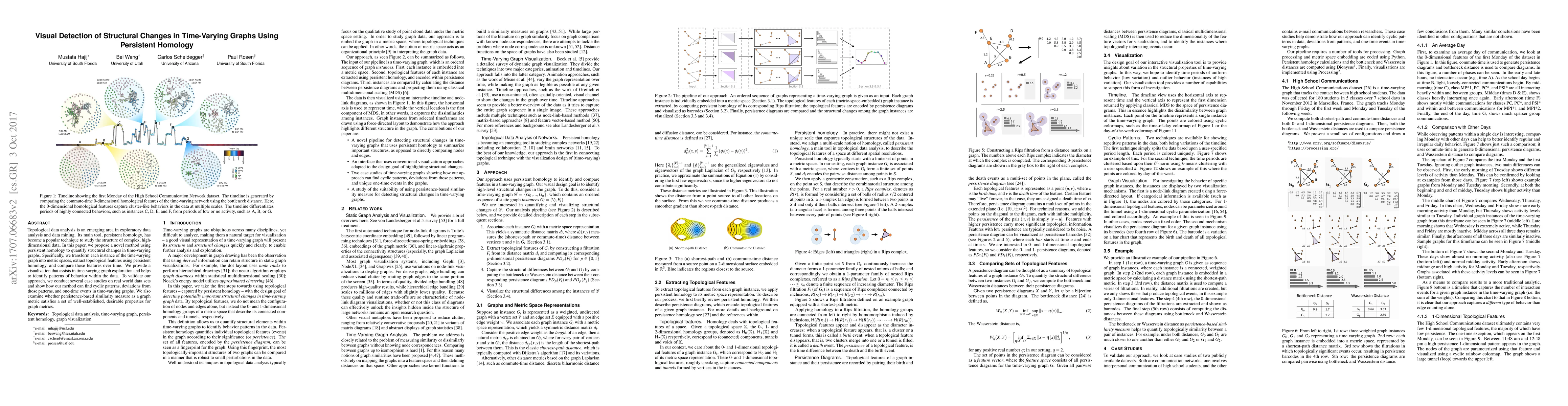 This paper proposes a method using persistent homology to detect structural changes in time-varying graphs by transforming them into metric spaces and extracting topological features. The approach provides visualizations to identify patterns and anomalies in the data, validated through real-world case studies.