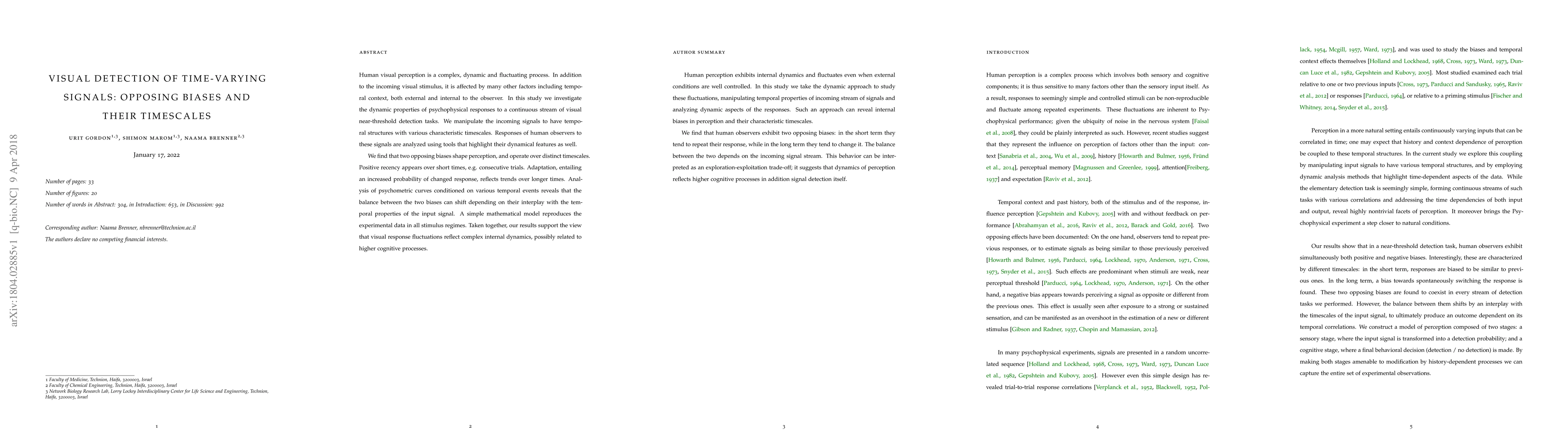 Researchers studied how humans perceive time-varying signals visually, finding two opposing biases that affect perception over different timescales: positive recency (short-term) and adaptation (longer-term). Their findings suggest that visual response fluctuations reflect complex internal dynamics related to higher cognitive processes.