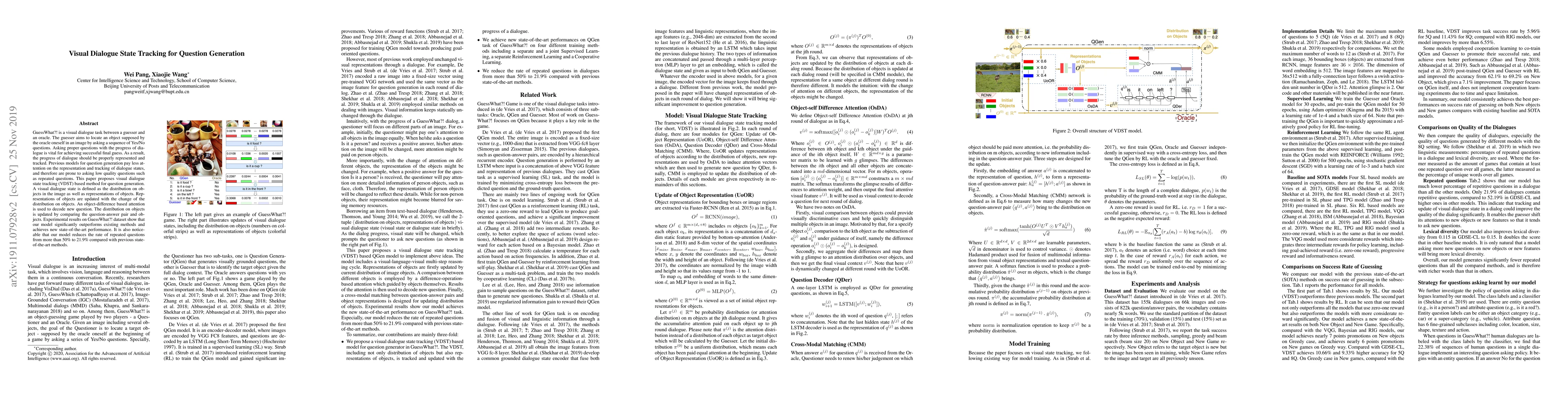 This paper introduces a visual dialogue state tracking (VDST) method for generating high-quality questions in the GuessWhat?! visual dialogue task, significantly improving question generation by updating object representations and reducing the rate of repeated questions from over 50% to 21.9%.