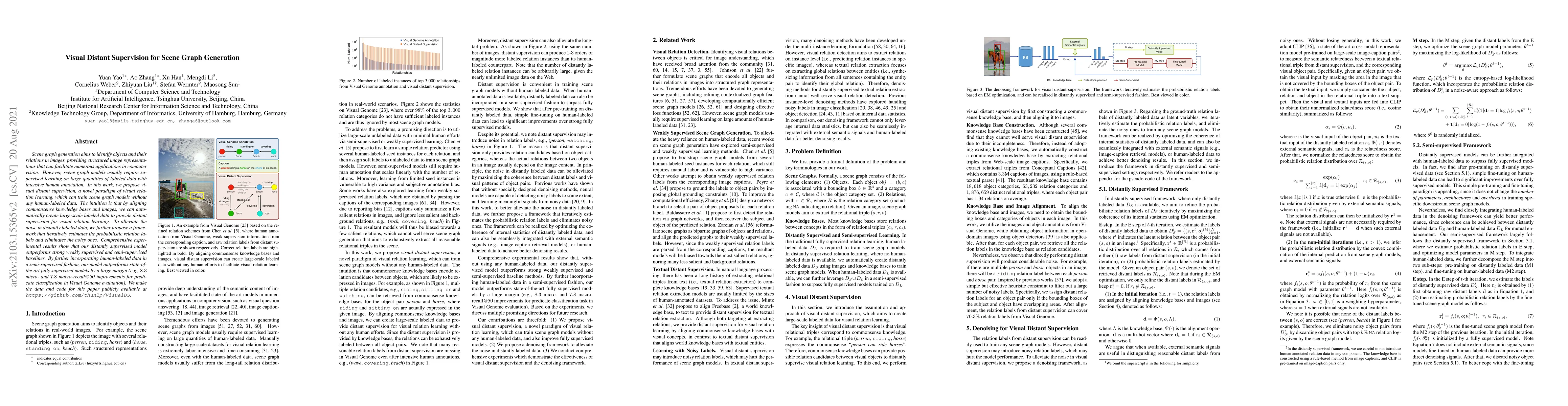 This paper introduces visual distant supervision for scene graph generation to reduce reliance on human-labeled data. It leverages commonsense knowledge bases to create large-scale labeled data, iteratively refining the labels to minimize noise, and demonstrates superior performance compared to weakly supervised and semi-supervised baselines.