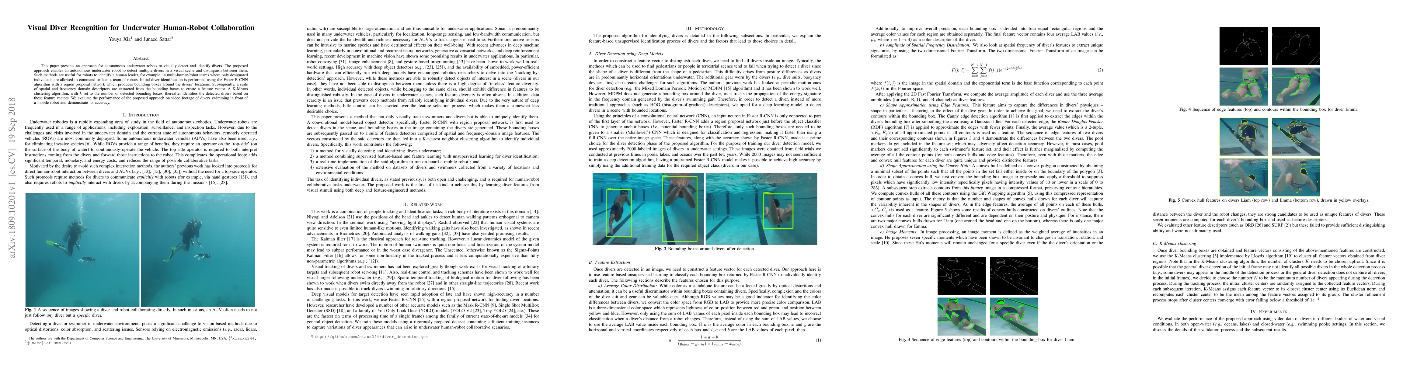 This paper proposes a method for autonomous underwater robots to visually detect and identify divers using Faster R-CNN and K-Means clustering, enabling robots to recognize designated human leaders in human-robot teams. The approach is validated through diver identification in underwater video footage.