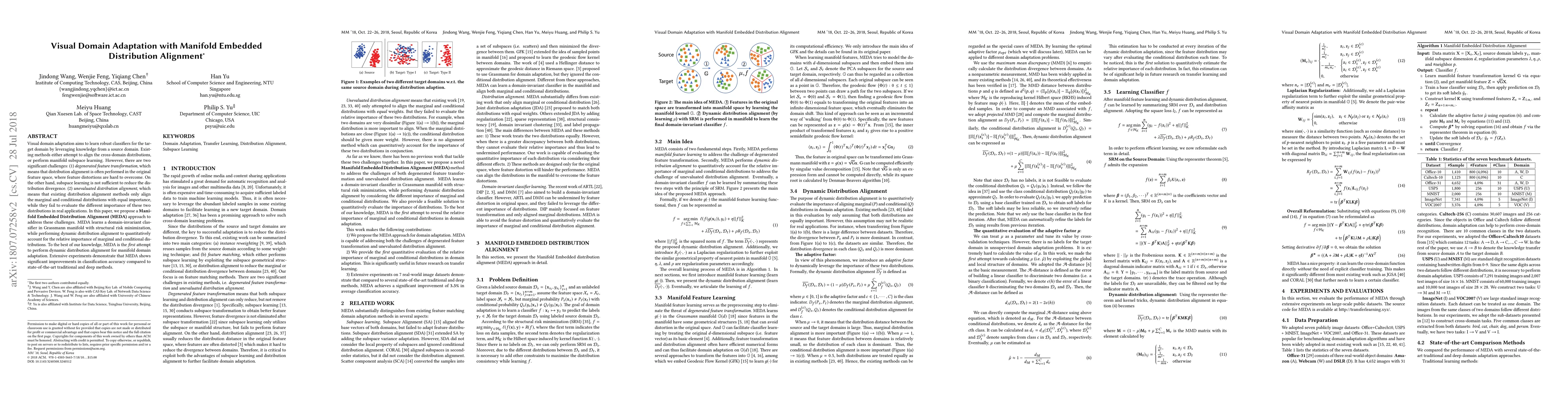 This paper proposes the Manifold Embedded Distribution Alignment (MEDA) approach to address challenges in visual domain adaptation, including feature transformation and unevaluated distribution alignment. MEDA dynamically aligns marginal and conditional distributions on the Grassmann manifold, showing significant improvements in classification accuracy over existing methods.