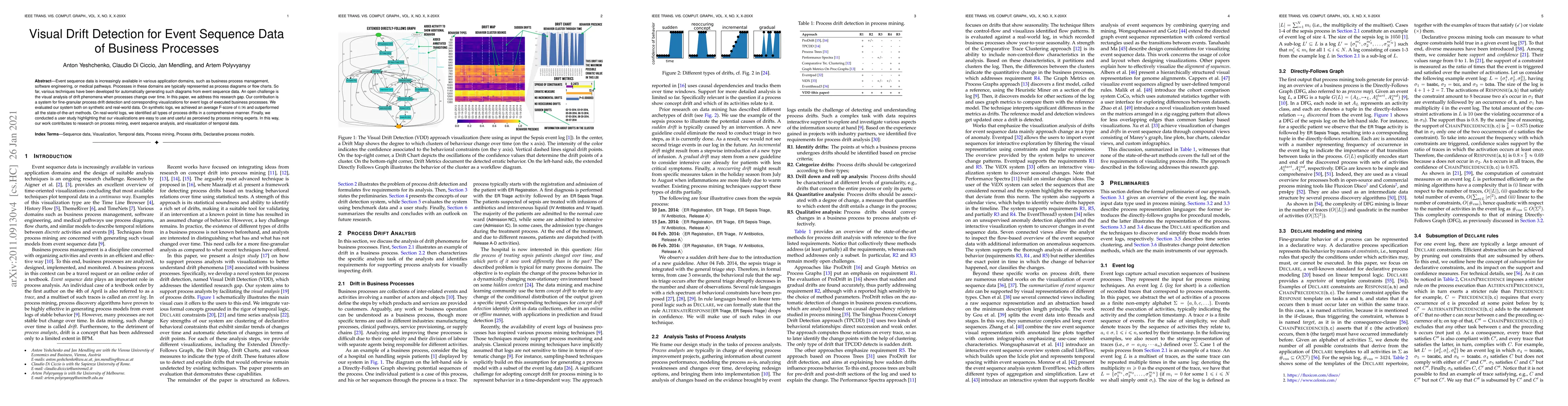 This paper introduces a system for detecting visual drift in business processes from event sequence data, providing fine-grained drift detection and visualizations. The system outperformed existing methods on synthetic data and successfully identified various drift types on real-world logs, validated by a user study indicating its usability and effectiveness.