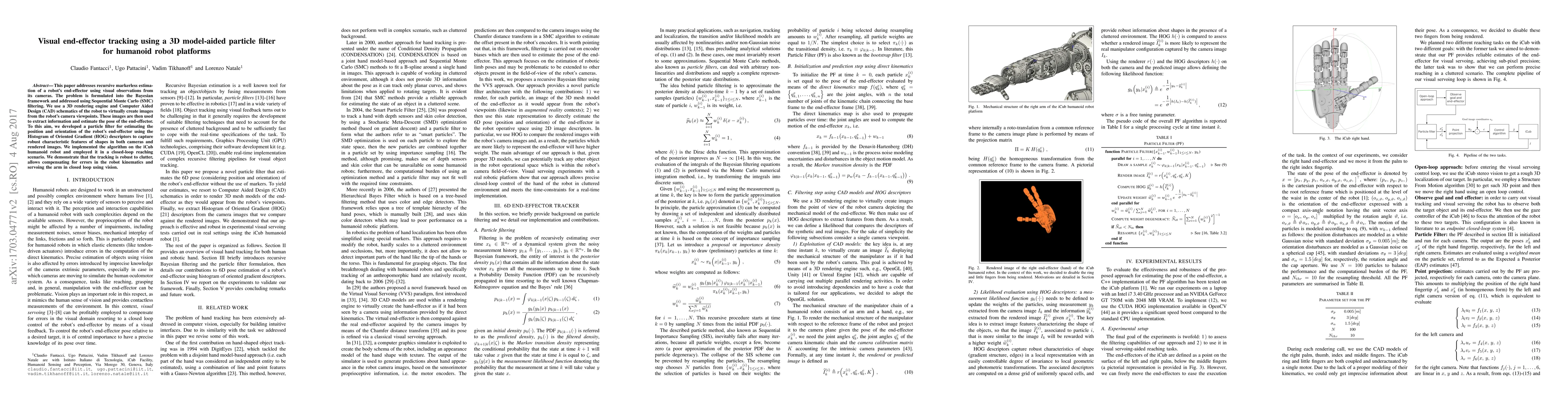 This paper presents a 3D model-aided particle filter for tracking a humanoid robot's end-effector using visual observations from its cameras, achieving robust results in cluttered environments.