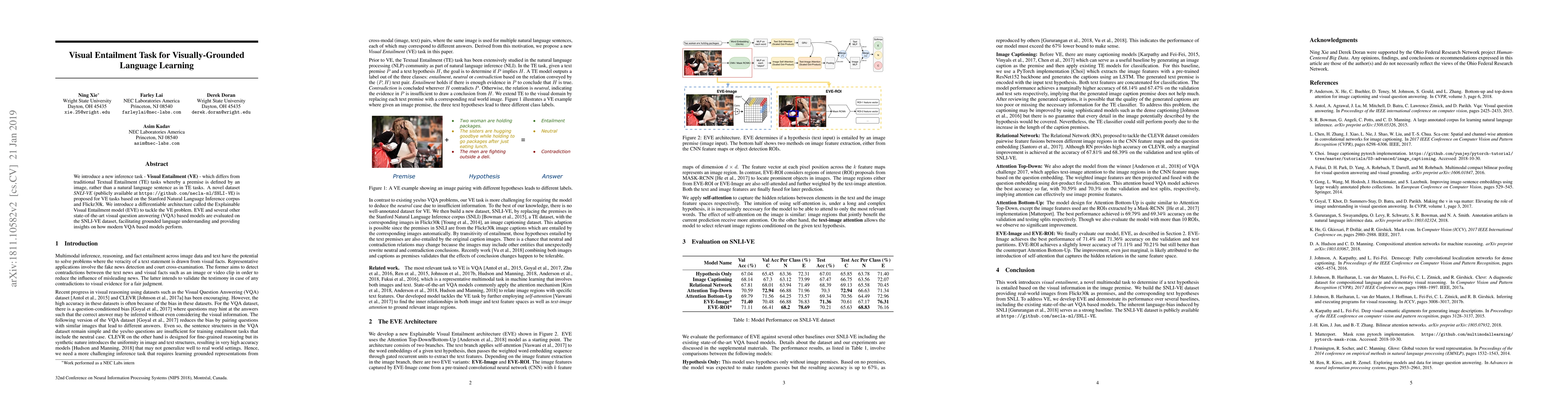 This paper introduces a Visual Entailment (VE) task, where an image serves as a premise instead of a text, and proposes a new dataset SNLI-VE. It presents the Explainable Visual Entailment model (EVE) to address VE and evaluates it against other state-of-the-art visual question answering models on the SNLI-VE dataset.