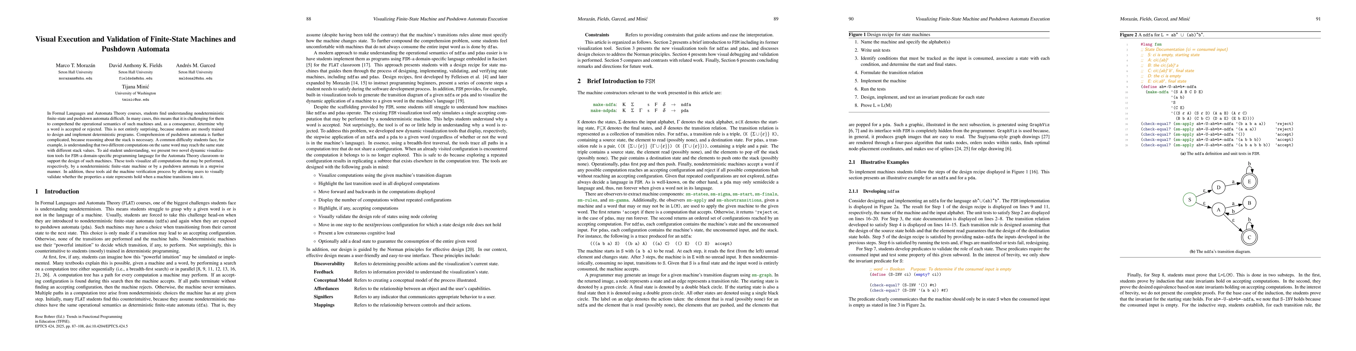 In Formal Languages and Automata Theory courses, students find understanding nondeterministic finite-state and pushdown automata difficult. In many cases, this means that it is challenging for them to comprehend the operational semantics of such machines and, as a consequence, determine why a word is accepted or rejected. This is not entirely surprising, because students are mostly trained to design and implement deterministic programs. Comprehension of pushdown automata is further complicated, because reasoning about the stack is necessary. A common difficulty students face, for example, is understanding that two different computations on the same word may reach the same state with different stack values. To aid student understanding, we present two novel dynamic visualization tools for FSM -- a domain-specific programming language for the Automata Theory classroom -- to support the design of such machines. These tools visualize all computations that may be performed, respectively, by a nondeterministic finite-state machine or by a pushdown automata in a stepwise manner. In addition, these tools aid the machine verification process by allowing users to visually validate whether the properties a state represents hold when a machine transitions into it.