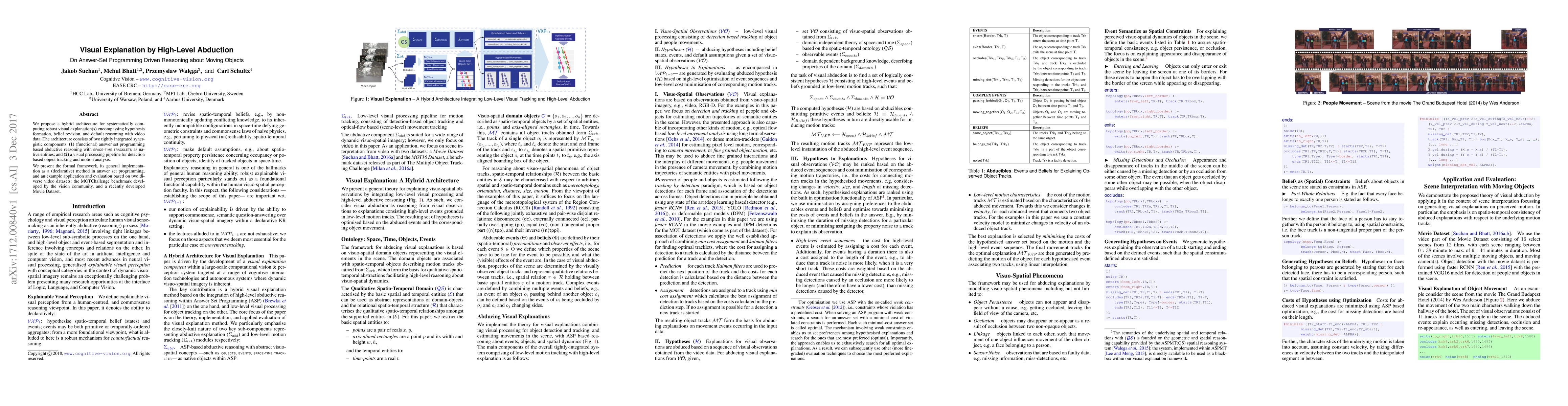 We propose a hybrid architecture for systematically computing robust visual explanation(s) encompassing hypothesis formation, belief revision, and default reasoning with video data. The architecture consists of two tightly integrated synergistic components: (1) (functional) answer set programming based abductive reasoning with space-time tracklets as native entities; and (2) a visual processing pipeline for detection based object tracking and motion analysis. We present the formal framework, its general implementation as a (declarative) method in answer set programming, and an example application and evaluation based on two diverse video datasets: the MOTChallenge benchmark developed by the vision community, and a recently developed Movie Dataset.