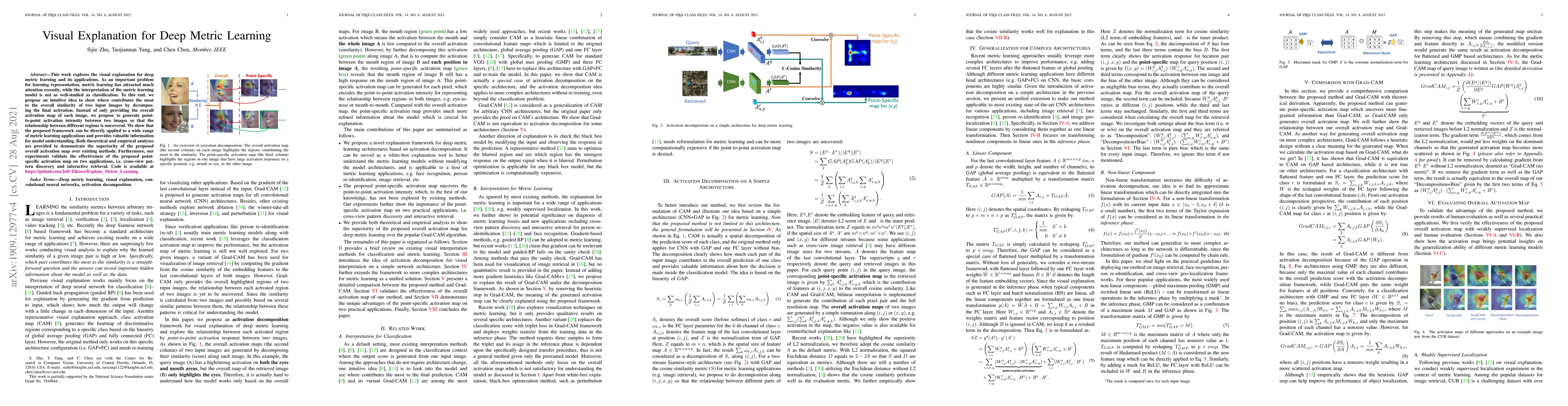 This work explores the visual explanation for deep metric learning and its applications. As an important problem for learning representation, metric learning has attracted much attention recently, while the interpretation of such model is not as well studied as classification. To this end, we propose an intuitive idea to show where contributes the most to the overall similarity of two input images by decomposing the final activation. Instead of only providing the overall activation map of each image, we propose to generate point-to-point activation intensity between two images so that the relationship between different regions is uncovered. We show that the proposed framework can be directly deployed to a large range of metric learning applications and provides valuable information for understanding the model. Furthermore, our experiments show its effectiveness on two potential applications, i.e. cross-view pattern discovery and interactive retrieval. The source code is available at \url{https://github.com/Jeff-Zilence/Explain_Metric_Learning}.