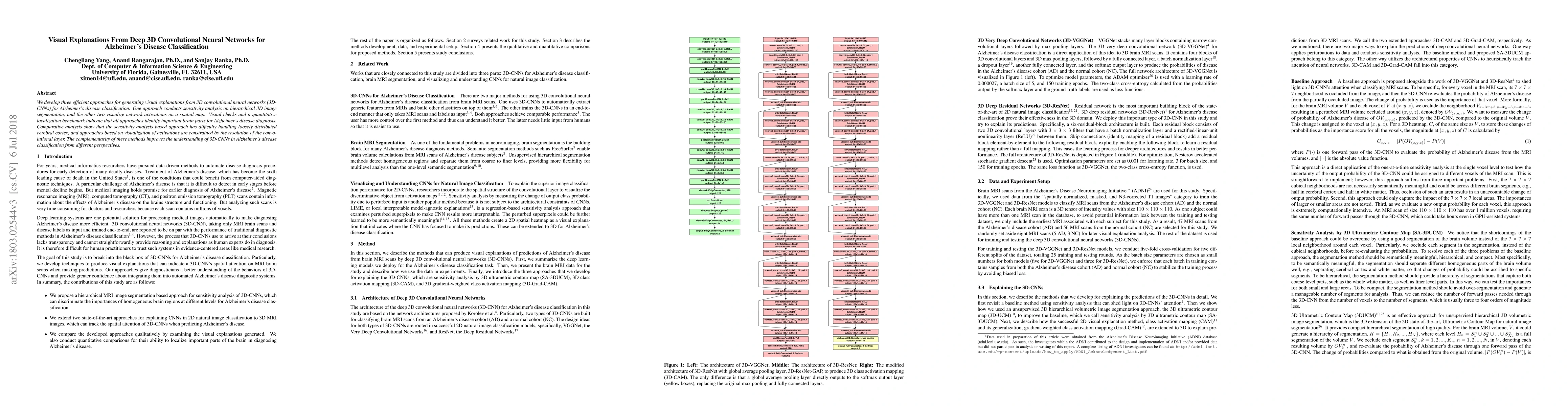 This research presents three methods for generating visual explanations from 3D convolutional neural networks to aid in Alzheimer's disease classification. These methods include sensitivity analysis on 3D image segmentation and visualization of network activations, each offering unique insights into brain regions important for diagnosis.