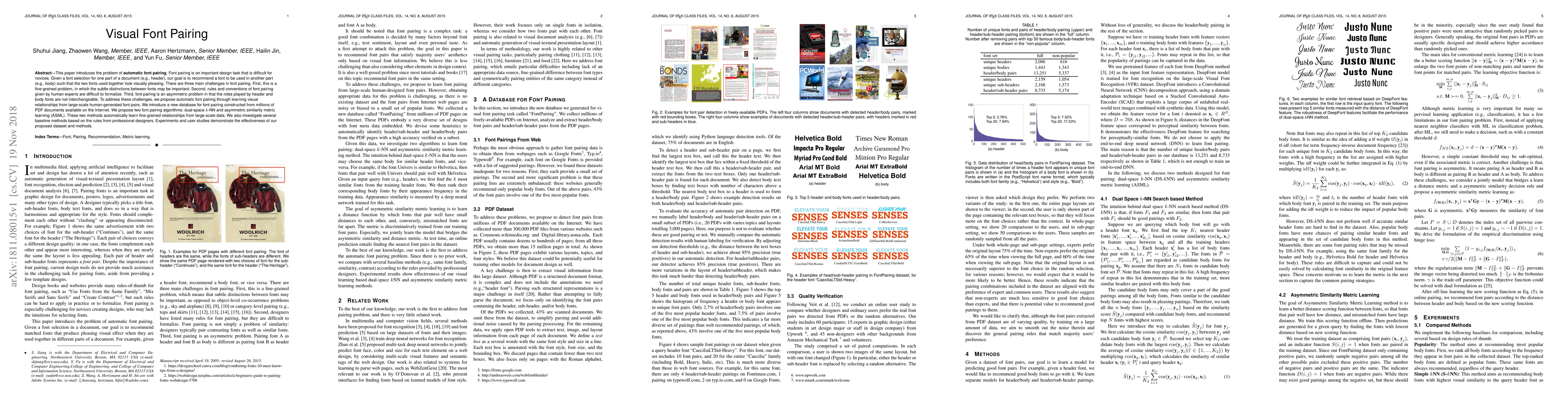 This paper presents an approach to automatically recommend visually harmonious font pairings for documents, addressing the challenges of fine-grained distinctions, informalization of expert rules, and the asymmetric nature of font roles. It introduces a new dataset and proposes two algorithms to learn visual relationships from large-scale human-generated font pairs, demonstrating their effectiveness through experiments and user studies.