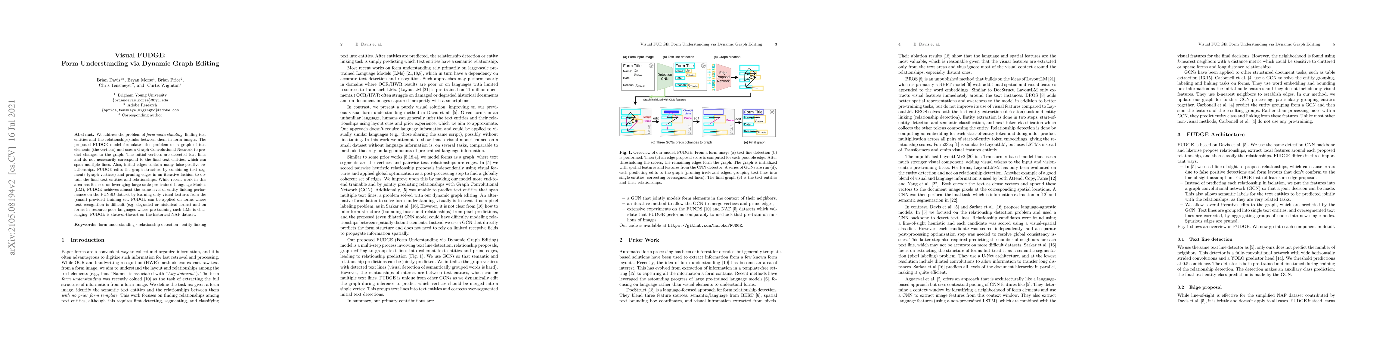 We address the problem of form understanding: finding text entities and the relationships/links between them in form images. The proposed FUDGE model formulates this problem on a graph of text elements (the vertices) and uses a Graph Convolutional Network to predict changes to the graph. The initial vertices are detected text lines and do not necessarily correspond to the final text entities, which can span multiple lines. Also, initial edges contain many false-positive relationships. FUDGE edits the graph structure by combining text segments (graph vertices) and pruning edges in an iterative fashion to obtain the final text entities and relationships. While recent work in this area has focused on leveraging large-scale pre-trained Language Models (LM), FUDGE achieves almost the same level of entity linking performance on the FUNSD dataset by learning only visual features from the (small) provided training set. FUDGE can be applied on forms where text recognition is difficult (e.g. degraded or historical forms) and on forms in resource-poor languages where pre-training such LMs is challenging. FUDGE is state-of-the-art on the historical NAF dataset.