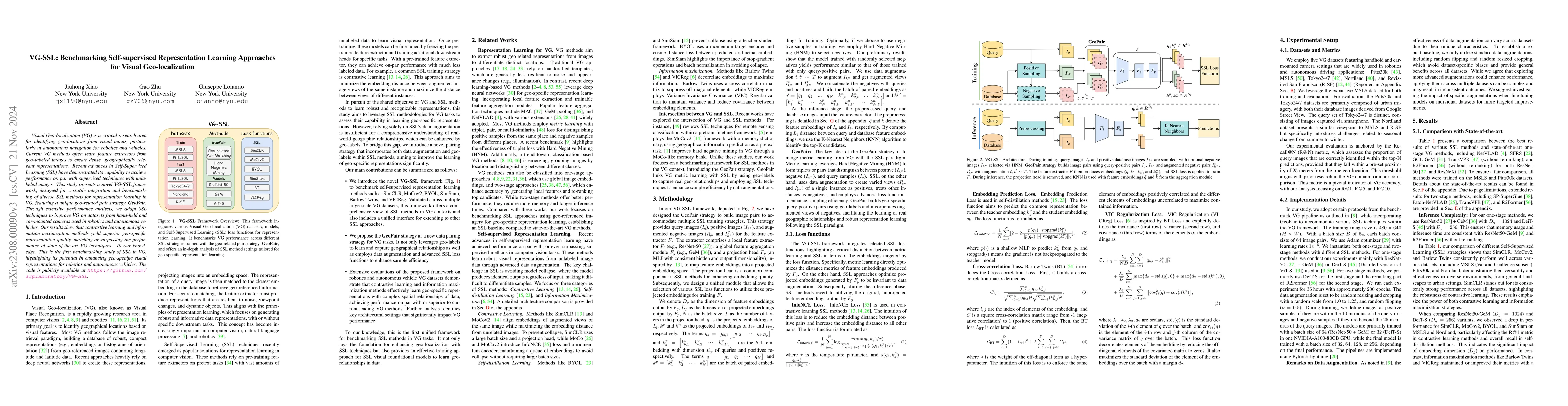 This paper introduces a unified framework for Visual Geo-localization using Self-Supervised Learning (SSL) methods, incorporating various SSL techniques like SimCLR and BYOL. The study shows that the proposed SSL-based approach can achieve comparable or superior geolocation accuracy to traditional methods, with improved training efficiency.