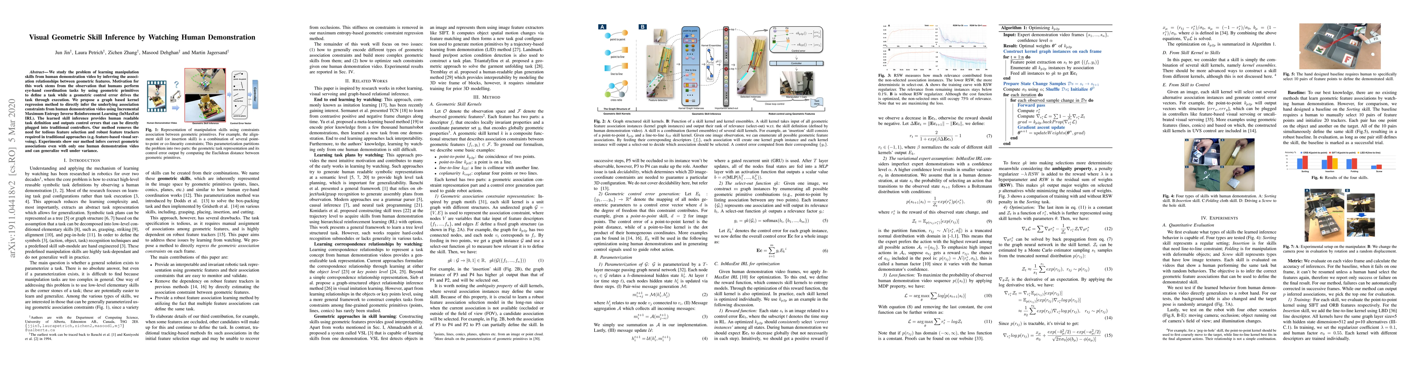 We study the problem of learning manipulation skills from human demonstration video by inferring the association relationships between geometric features. Motivation for this work stems from the observation that humans perform eye-hand coordination tasks by using geometric primitives to define a task while a geometric control error drives the task through execution. We propose a graph based kernel regression method to directly infer the underlying association constraints from human demonstration video using Incremental Maximum Entropy Inverse Reinforcement Learning (InMaxEnt IRL). The learned skill inference provides human readable task definition and outputs control errors that can be directly plugged into traditional controllers. Our method removes the need for tedious feature selection and robust feature trackers required in traditional approaches (e.g. feature-based visual servoing). Experiments show our method infers correct geometric associations even with only one human demonstration video and can generalize well under variance.