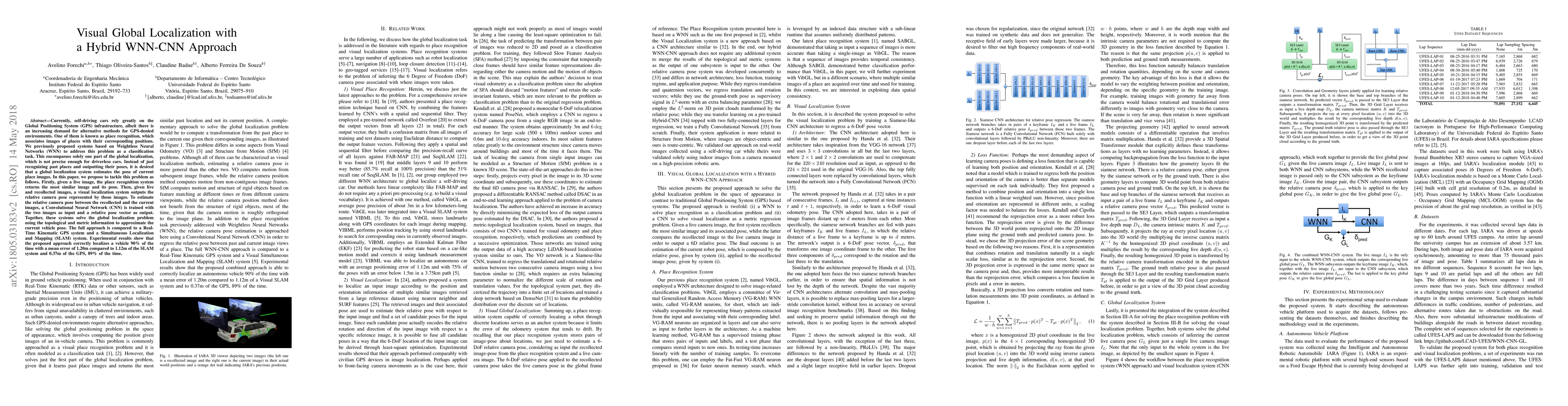 Currently, self-driving cars rely greatly on the Global Positioning System (GPS) infrastructure, albeit there is an increasing demand for alternative methods for GPS-denied environments. One of them is known as place recognition, which associates images of places with their corresponding positions. We previously proposed systems based on Weightless Neural Networks (WNN) to address this problem as a classification task. This encompasses solely one part of the global localization, which is not precise enough for driverless cars. Instead of just recognizing past places and outputting their poses, it is desired that a global localization system estimates the pose of current place images. In this paper, we propose to tackle this problem as follows. Firstly, given a live image, the place recognition system returns the most similar image and its pose. Then, given live and recollected images, a visual localization system outputs the relative camera pose represented by those images. To estimate the relative camera pose between the recollected and the current images, a Convolutional Neural Network (CNN) is trained with the two images as input and a relative pose vector as output. Together, these systems solve the global localization problem using the topological and metric information to approximate the current vehicle pose. The full approach is compared to a Real- Time Kinematic GPS system and a Simultaneous Localization and Mapping (SLAM) system. Experimental results show that the proposed approach correctly localizes a vehicle 90% of the time with a mean error of 1.20m compared to 1.12m of the SLAM system and 0.37m of the GPS, 89% of the time.