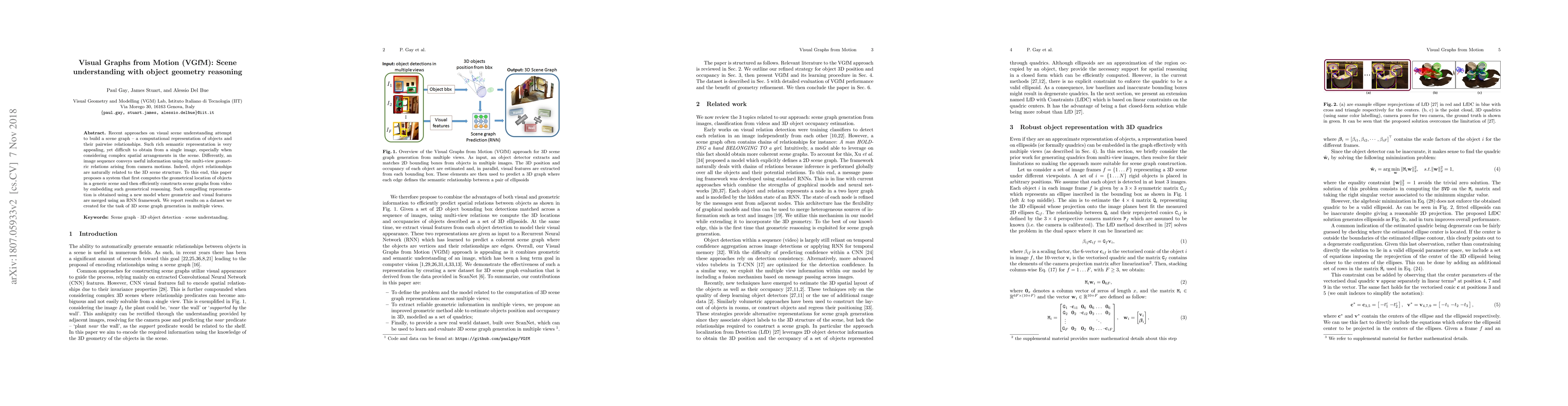 This paper proposes a system that uses video sequences to create 3D scene graphs with object geometry reasoning, merging geometric and visual features using an RNN framework.