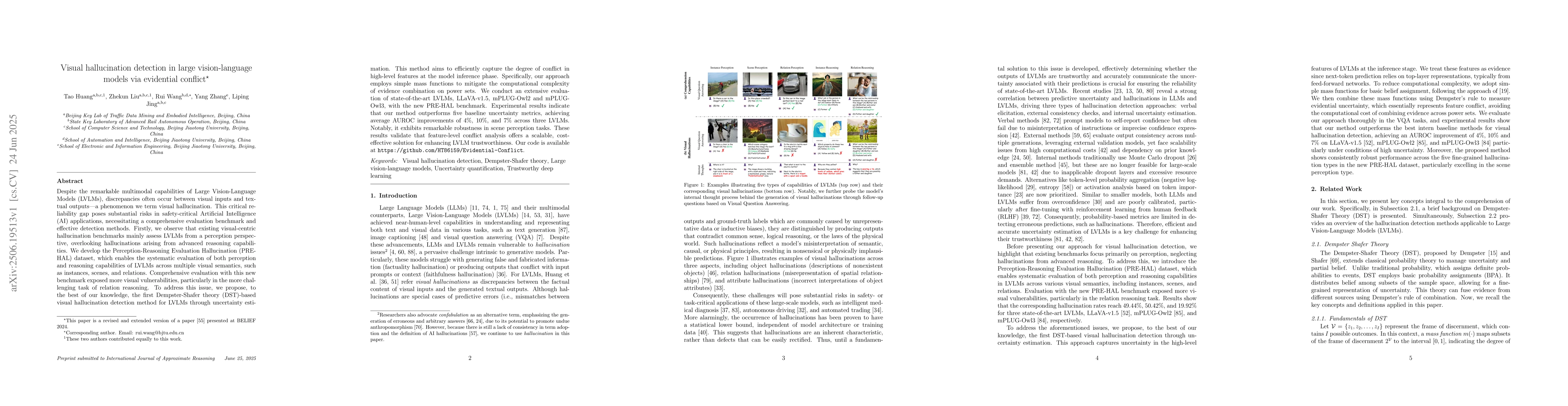 Despite the remarkable multimodal capabilities of Large Vision-Language Models (LVLMs), discrepancies often occur between visual inputs and textual outputs--a phenomenon we term visual hallucination. This critical reliability gap poses substantial risks in safety-critical Artificial Intelligence (AI) applications, necessitating a comprehensive evaluation benchmark and effective detection methods. Firstly, we observe that existing visual-centric hallucination benchmarks mainly assess LVLMs from a perception perspective, overlooking hallucinations arising from advanced reasoning capabilities. We develop the Perception-Reasoning Evaluation Hallucination (PRE-HAL) dataset, which enables the systematic evaluation of both perception and reasoning capabilities of LVLMs across multiple visual semantics, such as instances, scenes, and relations. Comprehensive evaluation with this new benchmark exposed more visual vulnerabilities, particularly in the more challenging task of relation reasoning. To address this issue, we propose, to the best of our knowledge, the first Dempster-Shafer theory (DST)-based visual hallucination detection method for LVLMs through uncertainty estimation. This method aims to efficiently capture the degree of conflict in high-level features at the model inference phase. Specifically, our approach employs simple mass functions to mitigate the computational complexity of evidence combination on power sets. We conduct an extensive evaluation of state-of-the-art LVLMs, LLaVA-v1.5, mPLUG-Owl2 and mPLUG-Owl3, with the new PRE-HAL benchmark. Experimental results indicate that our method outperforms five baseline uncertainty metrics, achieving average AUROC improvements of 4%, 10%, and 7% across three LVLMs. Our code is available at https://github.com/HT86159/Evidential-Conflict.