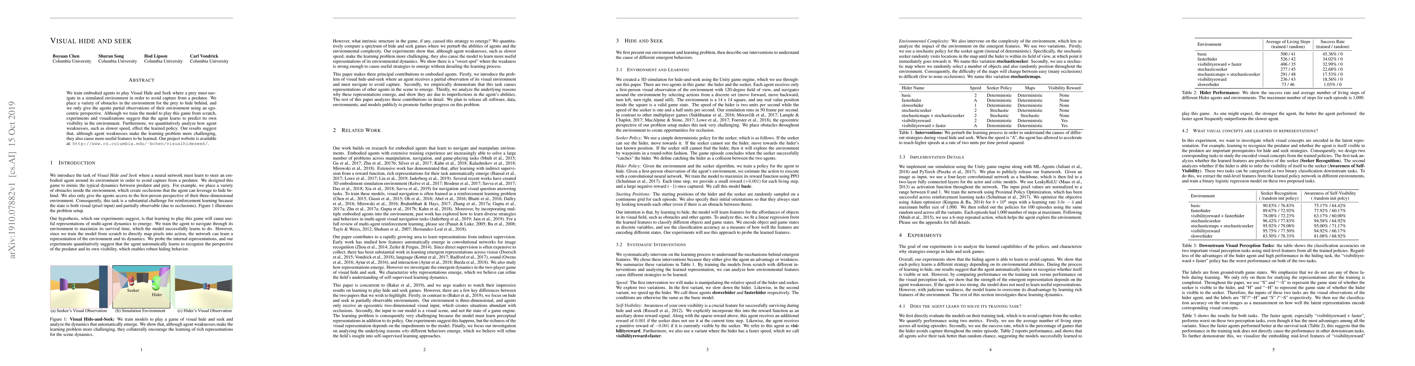 We train embodied agents to play Visual Hide and Seek where a prey must navigate in a simulated environment in order to avoid capture from a predator. We place a variety of obstacles in the environment for the prey to hide behind, and we only give the agents partial observations of their environment using an egocentric perspective. Although we train the model to play this game from scratch, experiments and visualizations suggest that the agent learns to predict its own visibility in the environment. Furthermore, we quantitatively analyze how agent weaknesses, such as slower speed, effect the learned policy. Our results suggest that, although agent weaknesses make the learning problem more challenging, they also cause more useful features to be learned. Our project website is available at: http://www.cs.columbia.edu/ ~bchen/visualhideseek/.