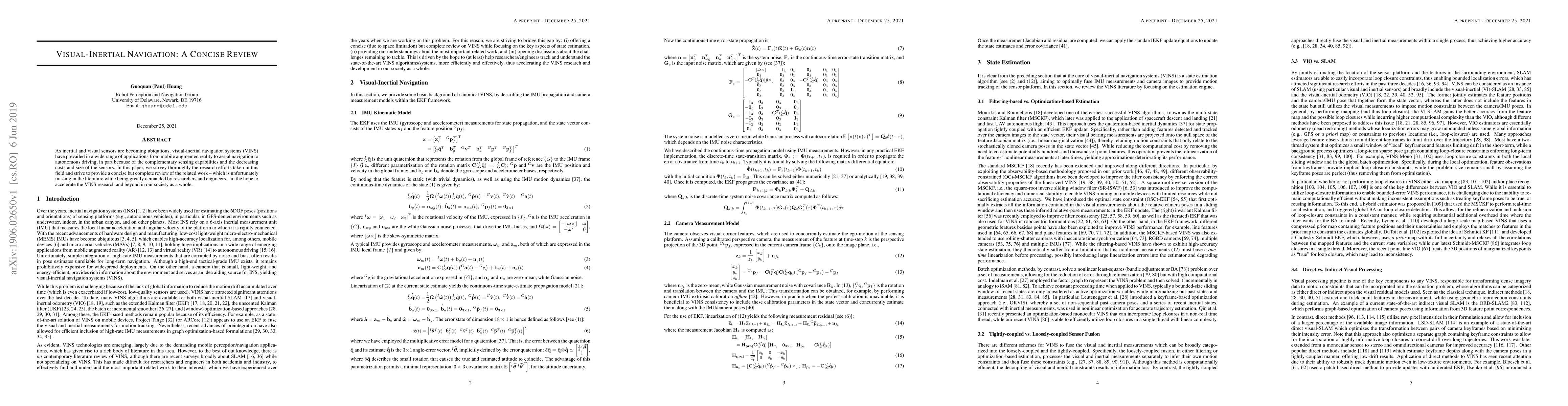 This paper provides a comprehensive review of visual-inertial navigation systems (VINS), highlighting the complementary nature of inertial and visual sensors and their applications in areas like augmented reality and autonomous driving. The review aims to fill a gap in the literature and accelerate research in this field.