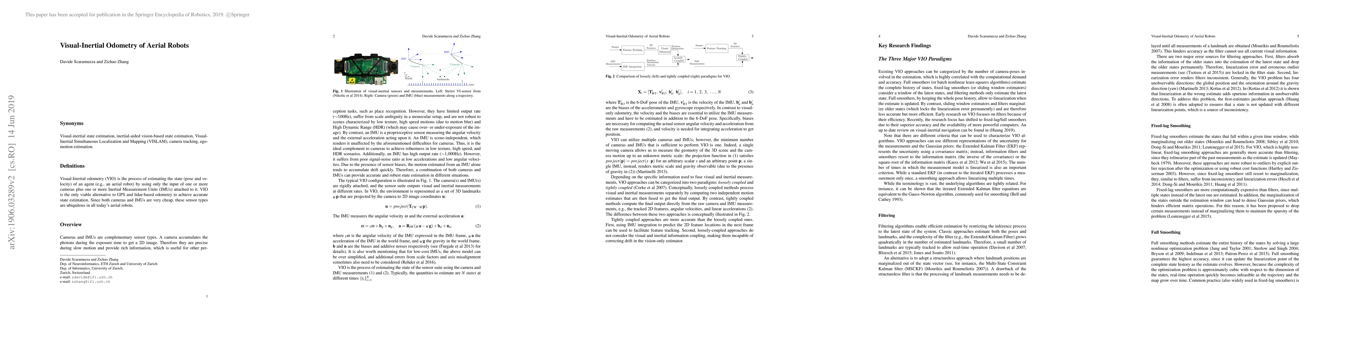 Visual-Inertial odometry (VIO) is the process of estimating the state (pose and velocity) of an agent (e.g., an aerial robot) by using only the input of one or more cameras plus one or more Inertial Measurement Units (IMUs) attached to it. VIO is the only viable alternative to GPS and lidar-based odometry to achieve accurate state estimation. Since both cameras and IMUs are very cheap, these sensor types are ubiquitous in all today's aerial robots.