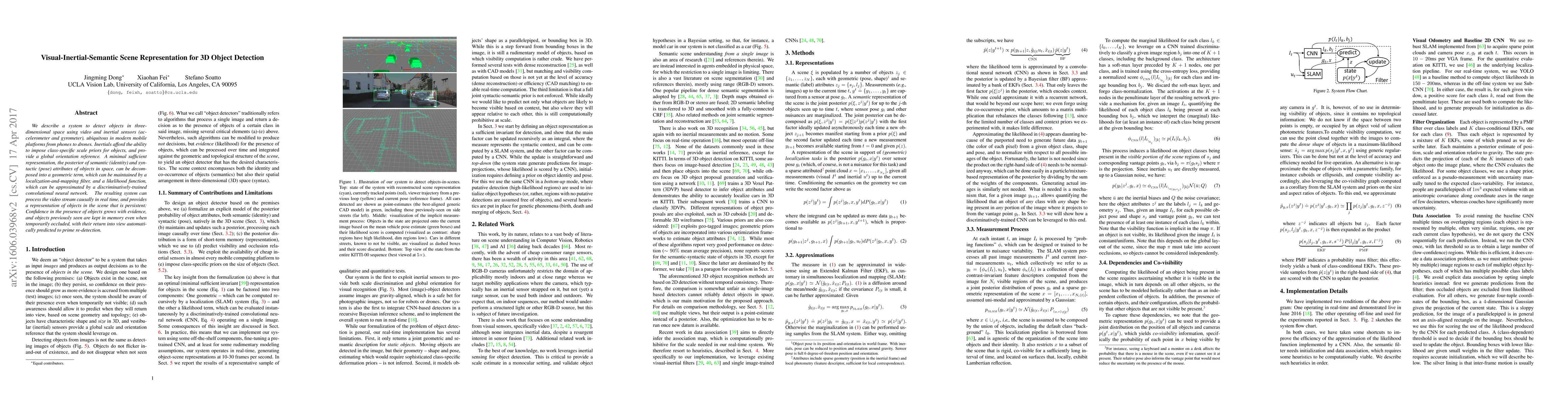 We describe a system to detect objects in three-dimensional space using video and inertial sensors (accelerometer and gyrometer), ubiquitous in modern mobile platforms from phones to drones. Inertials afford the ability to impose class-specific scale priors for objects, and provide a global orientation reference. A minimal sufficient representation, the posterior of semantic (identity) and syntactic (pose) attributes of objects in space, can be decomposed into a geometric term, which can be maintained by a localization-and-mapping filter, and a likelihood function, which can be approximated by a discriminatively-trained convolutional neural network. The resulting system can process the video stream causally in real time, and provides a representation of objects in the scene that is persistent: Confidence in the presence of objects grows with evidence, and objects previously seen are kept in memory even when temporarily occluded, with their return into view automatically predicted to prime re-detection.