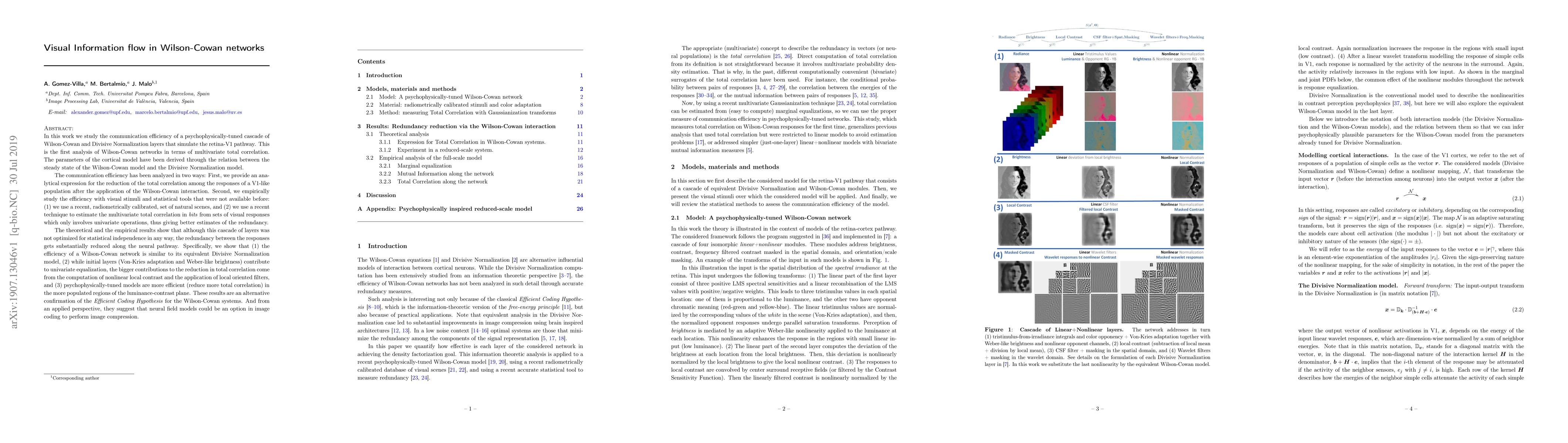In this work we study the communication efficiency of a psychophysically-tuned cascade of Wilson-Cowan and Divisive Normalization layers that simulate the retina-V1 pathway. This is the first analysis of Wilson-Cowan networks in terms of multivariate total correlation. The parameters of the cortical model have been derived through the relation between the steady state of the Wilson-Cowan model and the Divisive Normalization model. The communication efficiency has been analyzed in two ways: First, we provide an analytical expression for the reduction of the total correlation among the responses of a V1-like population after the application of the Wilson-Cowan interaction. Second, we empirically study the efficiency with visual stimuli and statistical tools that were not available before: (1) we use a recent, radiometrically calibrated, set of natural scenes, and (2) we use a recent technique to estimate the multivariate total correlation in bits from sets of visual responses which only involves univariate operations, thus giving better estimates of the redundancy. The theoretical and the empirical results show that although this cascade of layers was not optimized for statistical independence in any way, the redundancy between the responses gets substantially reduced along the neural pathway. Specifically, we show that (1)~the efficiency of a Wilson-Cowan network is similar to its equivalent Divisive Normalization model, (2) while initial layers (Von-Kries adaptation and Weber-like brightness) contribute to univariate equalization, the bigger contributions to the reduction in total correlation come from the computation of nonlinear local contrast and the application of local oriented filters, and (3)~psychophysically-tuned models are more efficient (reduce more total correlation) in the more populated regions of the luminance-contrast plane.
