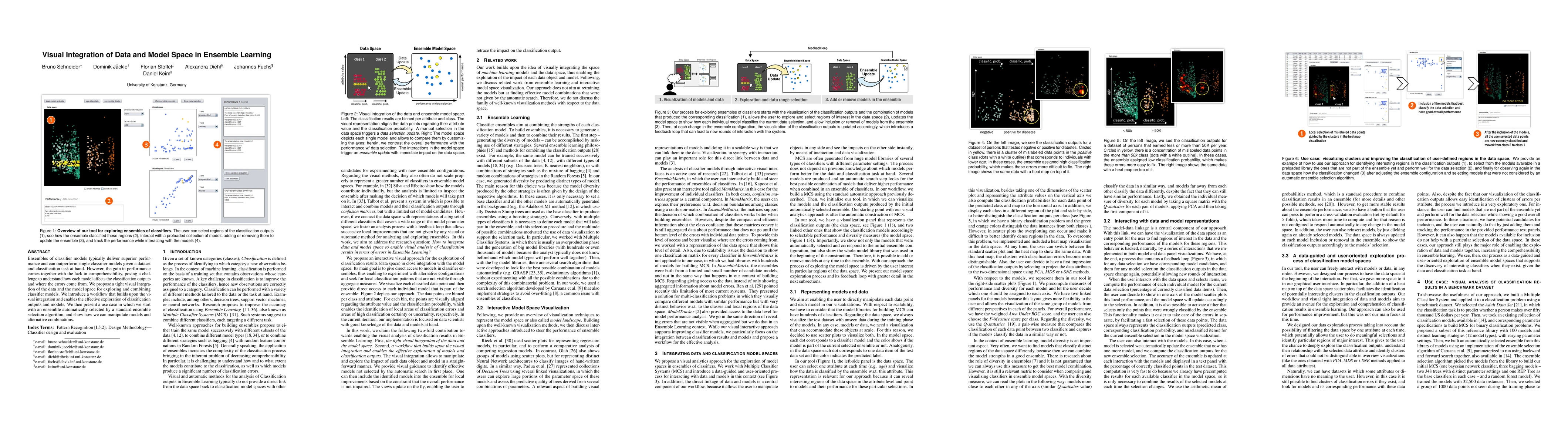 Ensembles of classifier models typically deliver superior performance and can outperform single classifier models given a dataset and classification task at hand. However, the gain in performance comes together with the lack in comprehensibility, posing a challenge to understand how each model affects the classification outputs and where the errors come from. We propose a tight visual integration of the data and the model space for exploring and combining classifier models. We introduce a workflow that builds upon the visual integration and enables the effective exploration of classification outputs and models. We then present a use case in which we start with an ensemble automatically selected by a standard ensemble selection algorithm, and show how we can manipulate models and alternative combinations.