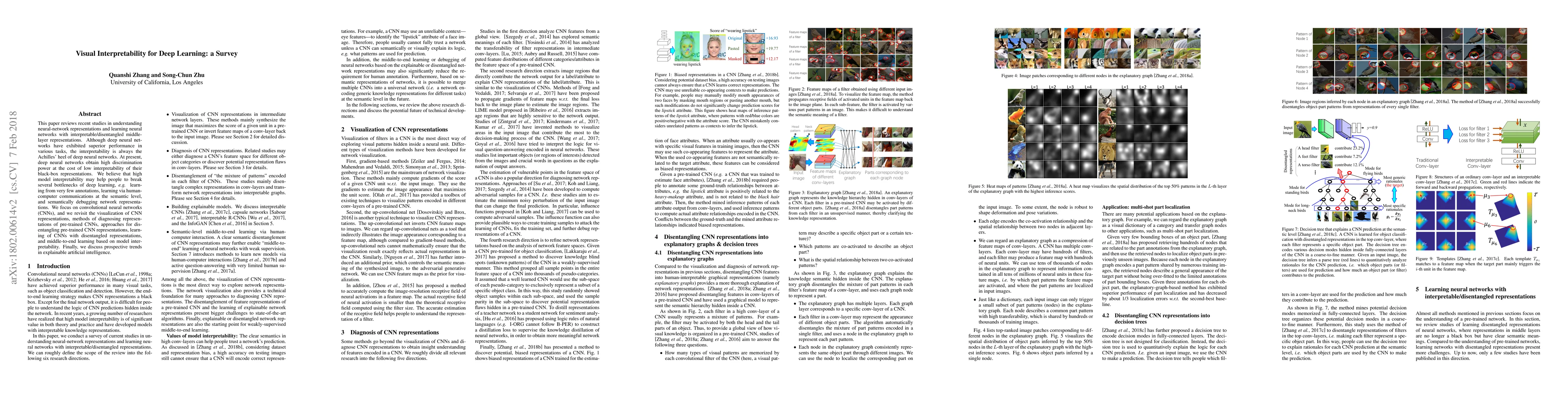 This paper reviews recent studies in understanding neural-network representations and learning neural networks with interpretable/disentangled middle-layer representations. Although deep neural networks have exhibited superior performance in various tasks, the interpretability is always the Achilles' heel of deep neural networks. At present, deep neural networks obtain high discrimination power at the cost of low interpretability of their black-box representations. We believe that high model interpretability may help people to break several bottlenecks of deep learning, e.g., learning from very few annotations, learning via human-computer communications at the semantic level, and semantically debugging network representations. We focus on convolutional neural networks (CNNs), and we revisit the visualization of CNN representations, methods of diagnosing representations of pre-trained CNNs, approaches for disentangling pre-trained CNN representations, learning of CNNs with disentangled representations, and middle-to-end learning based on model interpretability. Finally, we discuss prospective trends in explainable artificial intelligence.