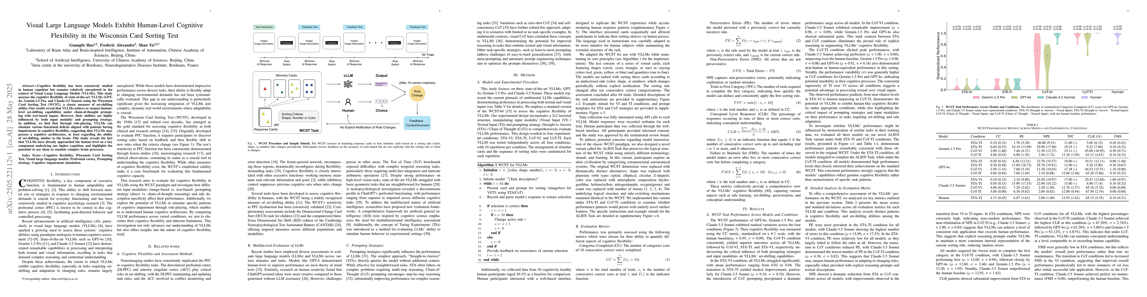 Visual Large Language Models (VLLMs) have achieved human-level cognitive flexibility in the Wisconsin Card Sorting Test, surpassing set-shifting capabilities with text-based inputs. This study highlights their potential to emulate complex brain processes and suggests a cognitive architecture similar to the human brain.