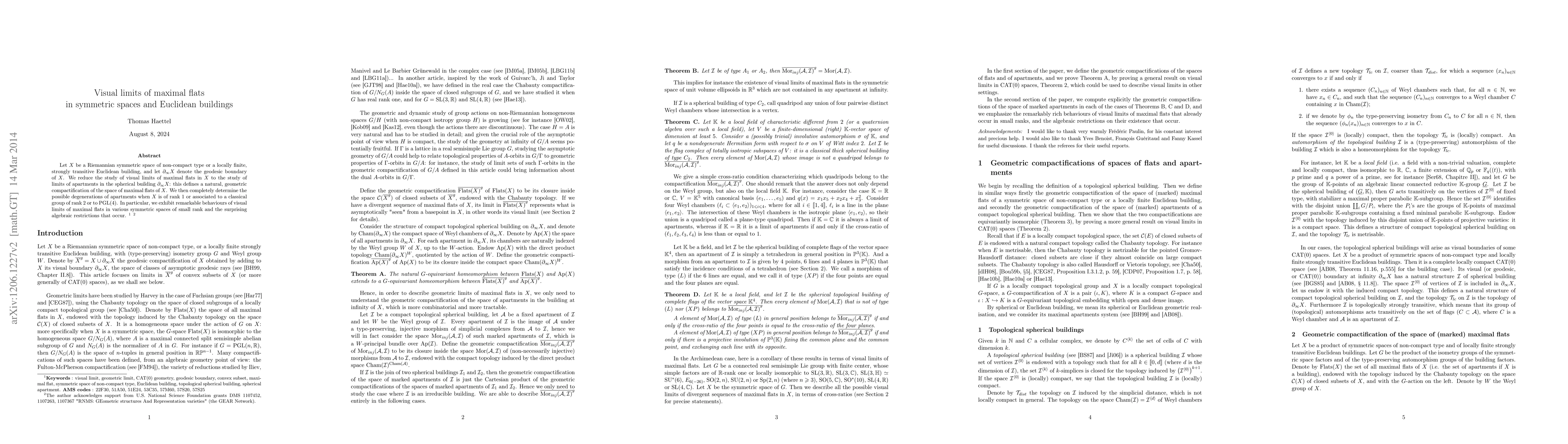 Let X be a symmetric space of non-compact type or a locally finite, strongly transitive Euclidean building, and let B denote the geodesic boundary of X. We reduce the study of visual limits of maximal flats in X to the study of limits of apartments in the spherical building B: this defines a natural, geometric compactification of the space of maximal flats of X. We then completely determine the possible degenerations of apartments when X is of rank 1, associated to a classical group of rank 2 or to PGL(4). In particular, we exhibit remarkable behaviours of visual limits of maximal flats in various symmetric spaces of small rank and surprising algebraic restrictions that occur.